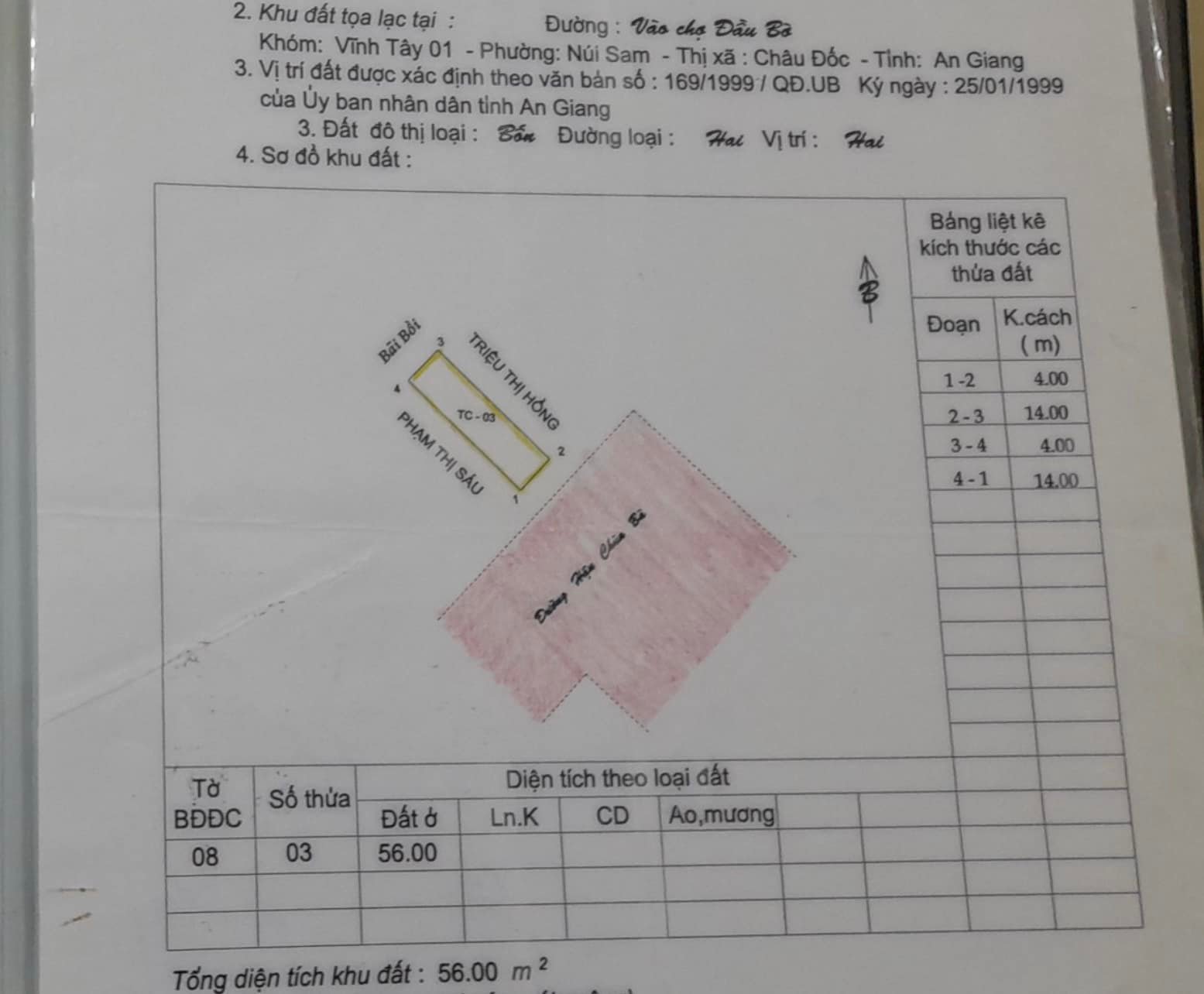 – Diện tích đất Ngang 4m x dài 14m = 56m2 ( phía sau là bờ kênh taluy còn rất dài).