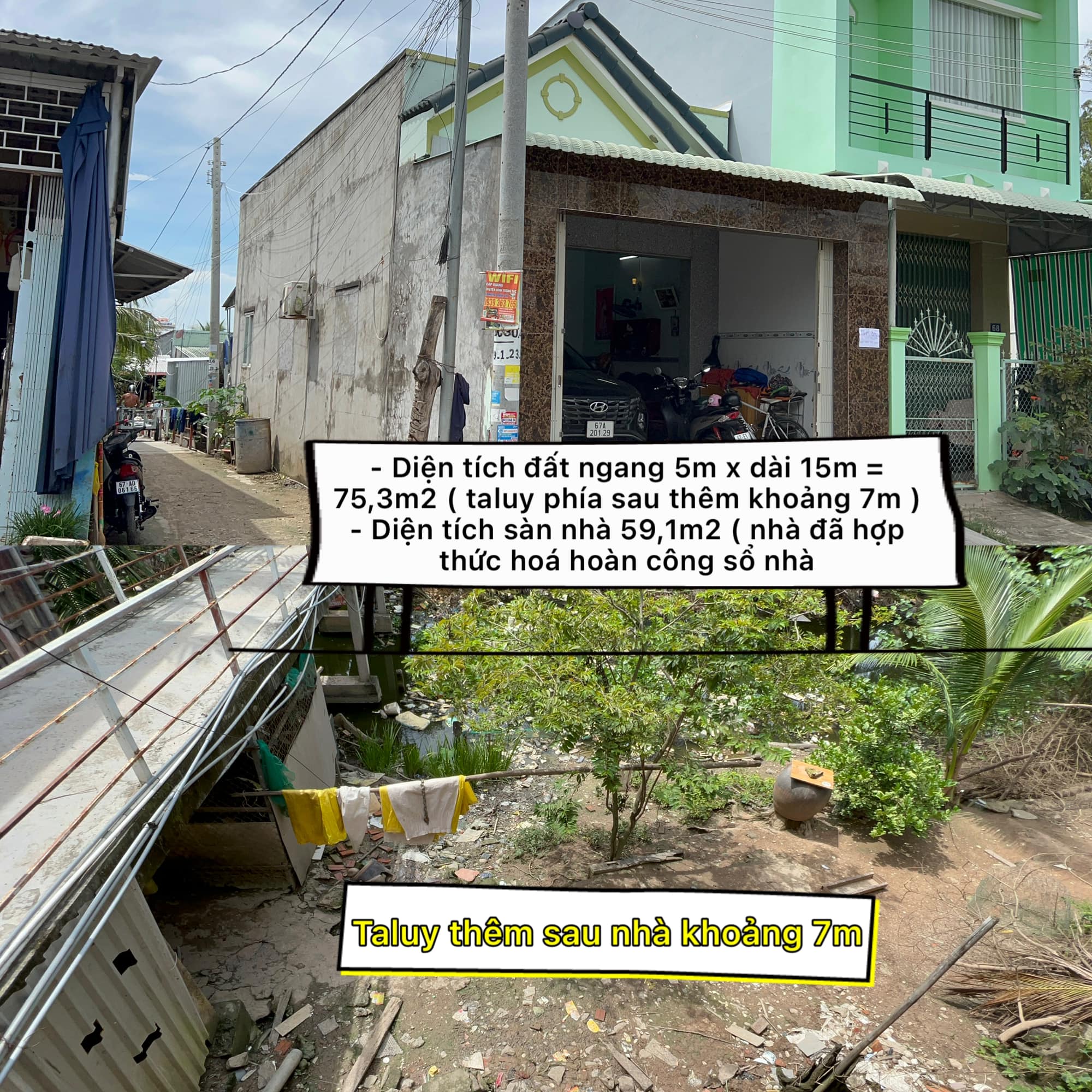 – Diện tích đất ngang 5m x dài 15m = 75,3m2 ( taluy phía sau thêm khoảng 7m )