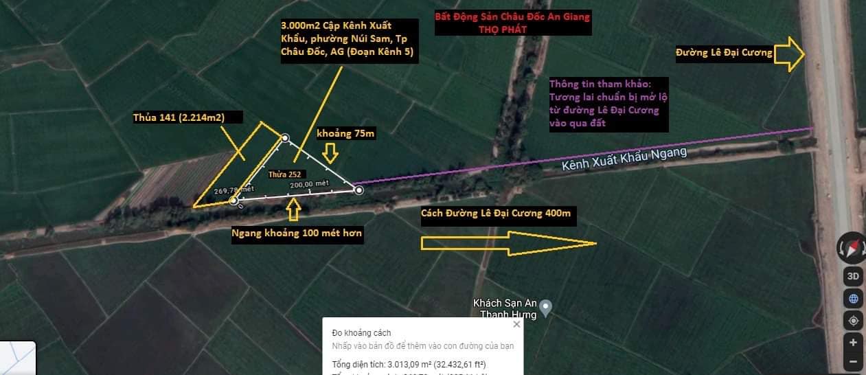 Cần bán 3.000 m2 Đất Lúa hình Kim Tự Tháp, tựa sơn nghinh thuỷ cập kênh Xuất Khẩu thuộc kênh 5, Núi Sam, thành phố Châu Đốc, tỉnh An Giang, cách đường Lê Đại Cương 400m. Mặt tiền ngang khoảng 100m hơn