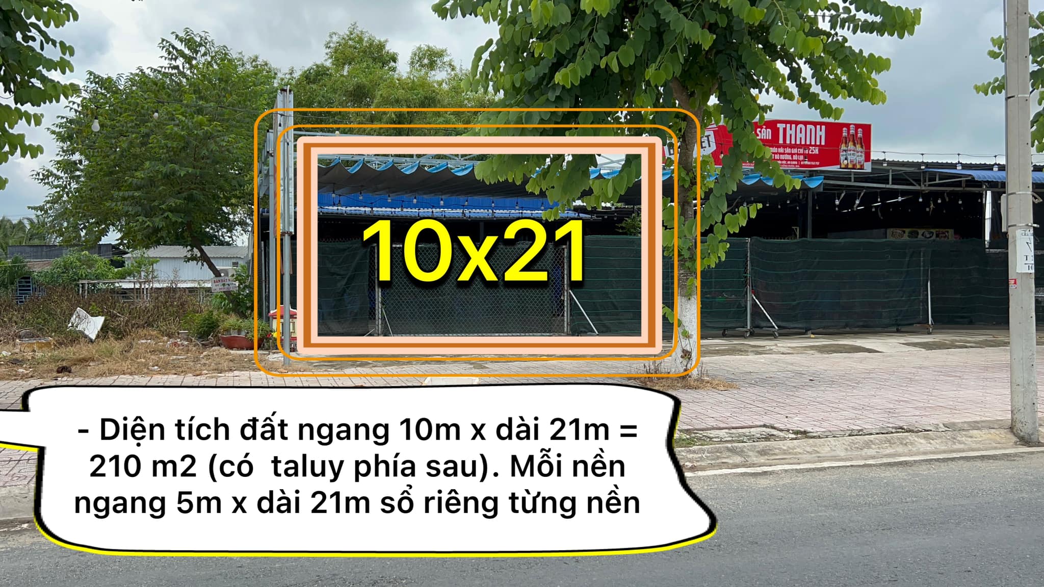 – Diện tích đất ngang 10 x dài 21m = 210 m2 (có taluy phía sau). Mỗi nền ngang 5m x dài 21m sổ riêng từng nền