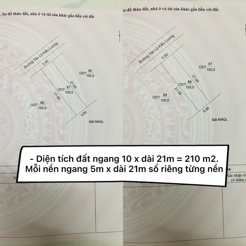 – Diện tích đất ngang 10 x dài 21m = 210 m2. Mỗi nền ngang 5m x dài 21m sổ riêng từng nền