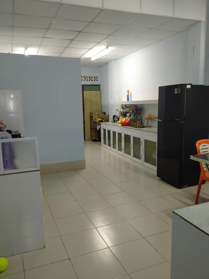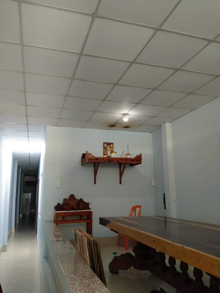 1. Nhà trước gồm 1 phòng khách lớn, 2 phòng ngủ, 3 nhà vệ sinh, 1 nhà bếp rộng rãi, sàn lót gạch, vách tường, trần nhà ốp la phông mái tole dài khoảng 40m.