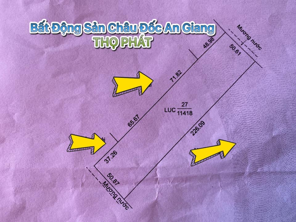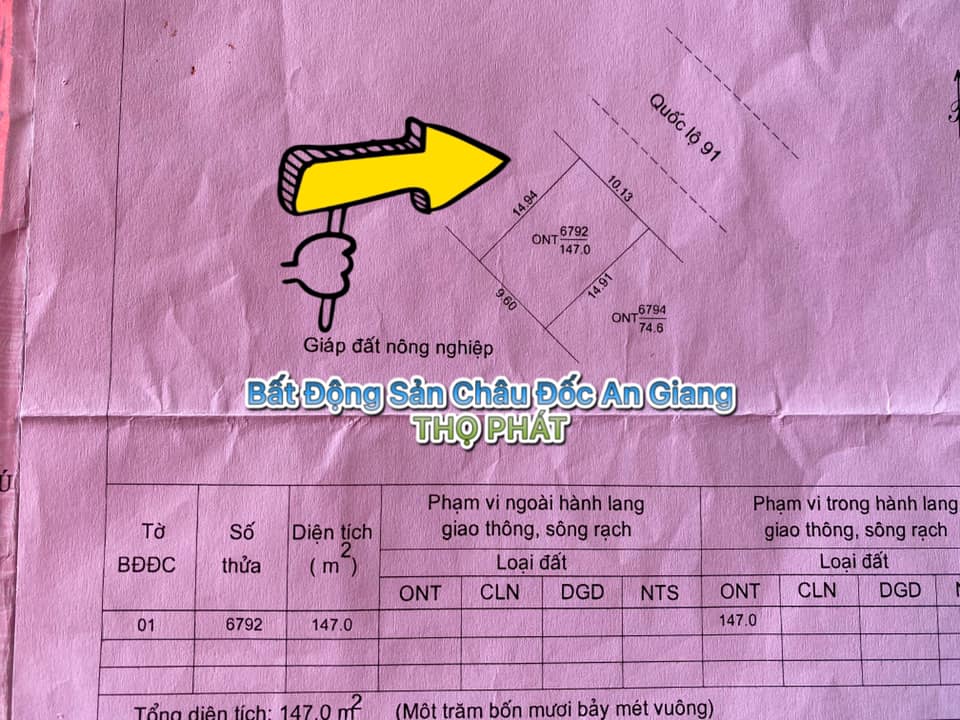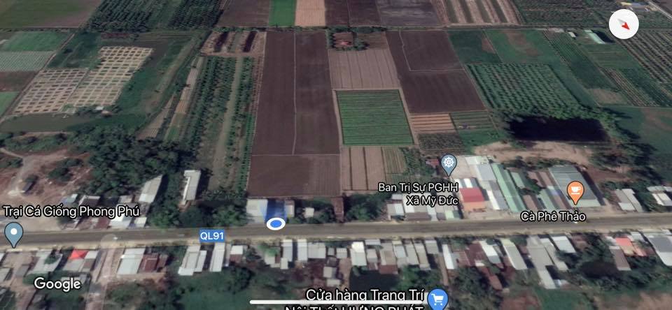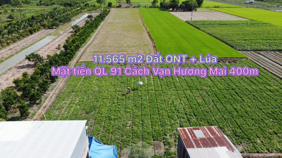 Cần bán 11.565 m2 đất ONT + Lúa. Mặt tiền đường QL 91 xã Mỹ Đức cách Vạn Hương Mai 400m hướng Châu Đốc – Long Xuyên. Trong đó có 147 m2 Đất thổ cư mặt tiền ( ngang 10m dài gần 15m ) nối tới 11.418 m2 đất lúa ( ngang gần 51m dài 226m). Giá 5 tỷ 500 triệu còn thương lượng trực tiếp chính chủ. Liên hệ 0942.304.944 hoặc 0989.991.394 Gặp Em Thọ. Cụ thể như sau: