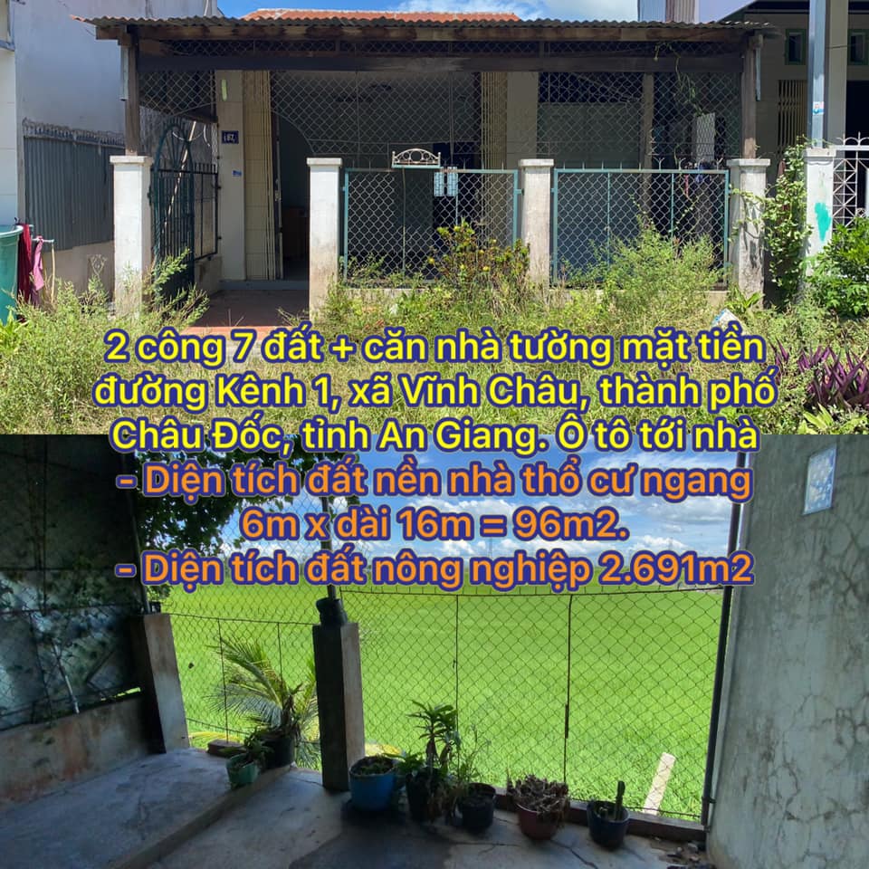 Cần bán 2 công 7 đất + căn nhà tường mặt tiền đường Kênh 1, xã Vĩnh Châu, thành phố Châu Đốc, tỉnh An Giang. Ô tô tới nhà