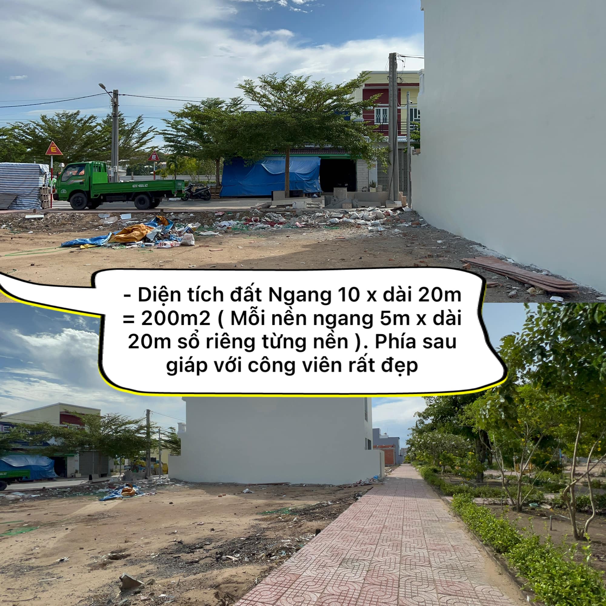 – Diện tích đất Ngang 10 x dài 20m = 200m2 ( Mỗi nền ngang 5m x dài 20m sổ riêng từng nền ). Phía sau giáp với công viên rất đẹp