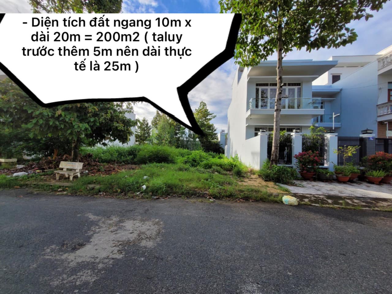 – Diện tích đất ngang 10m x dài 20m = 200m2 ( taluy trước thêm 5m nên dài thực tế là 25m )