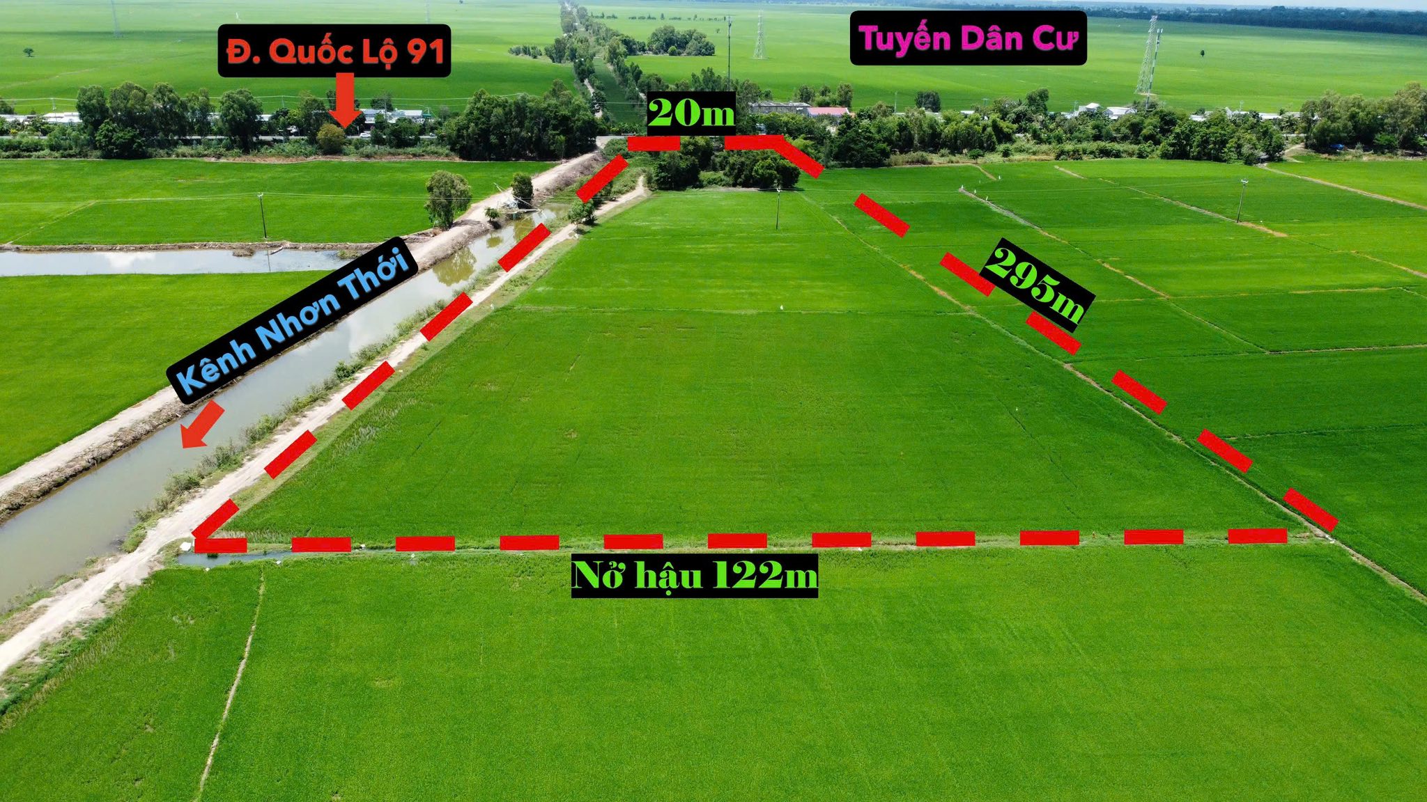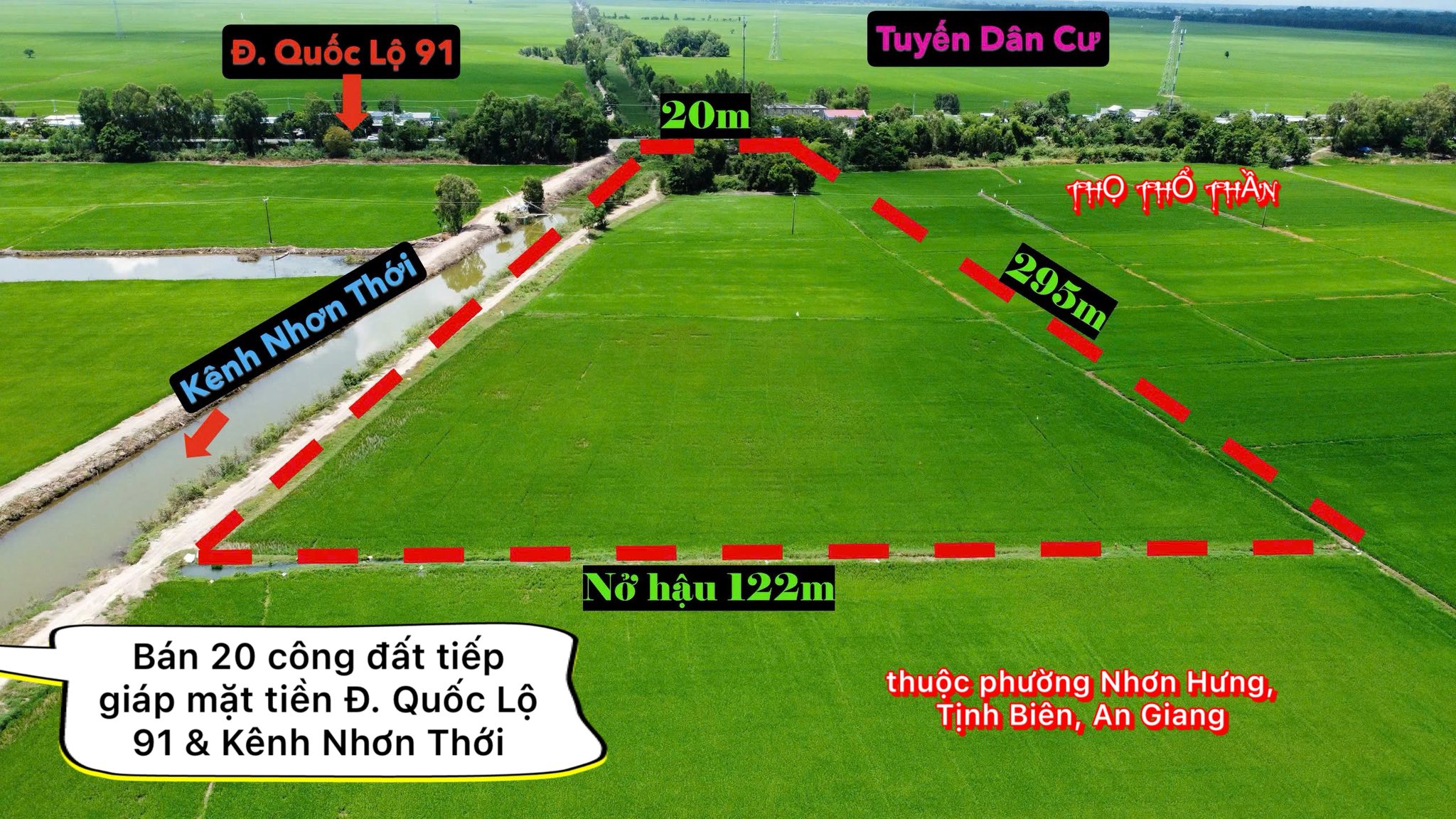 Cần bán 20 công đất tiếp giáp mặt tiền Đ. Quốc Lộ 91 & Kênh Nhơn Thới thuộc phường Nhơn Hưng, thị xã Tịnh Biên, tỉnh An Giang