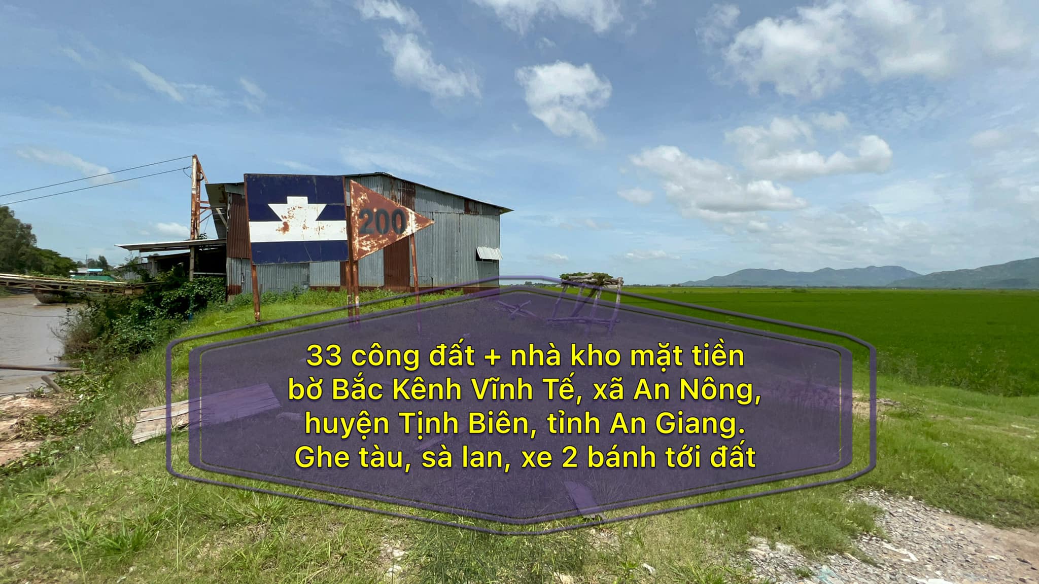 Cần bán 33 công đất + nhà kho mặt tiền bờ Bắc Kênh Vĩnh Tế, xã An Nông, huyện Tịnh Biên, tỉnh An Giang. Ghe tàu, sà lan, xe 2 bánh tới đất.