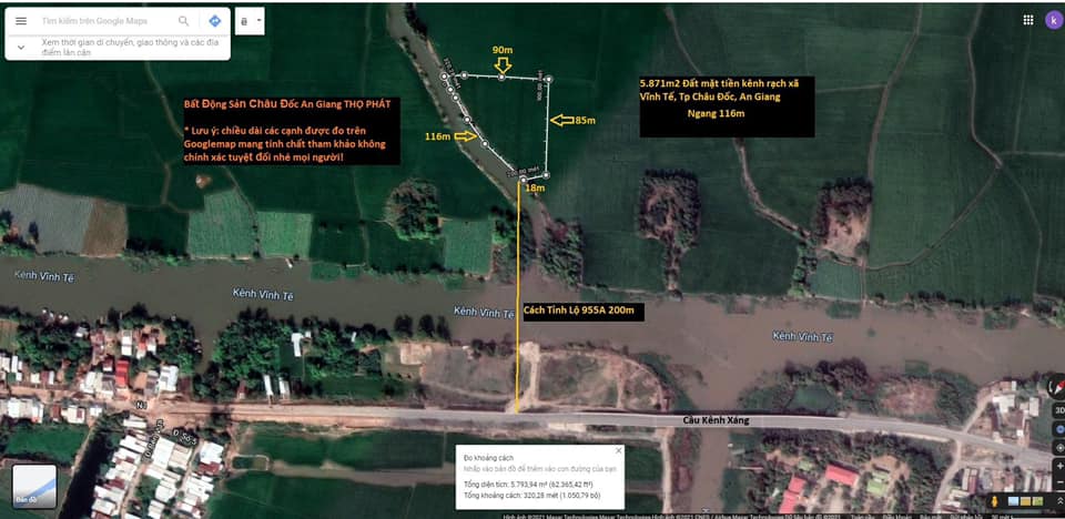 – Mặt tiền dọc theo con rạch tầm 116m. Chiều dài cạnh trái tầm 90m & cạnh phải tầm 18m.