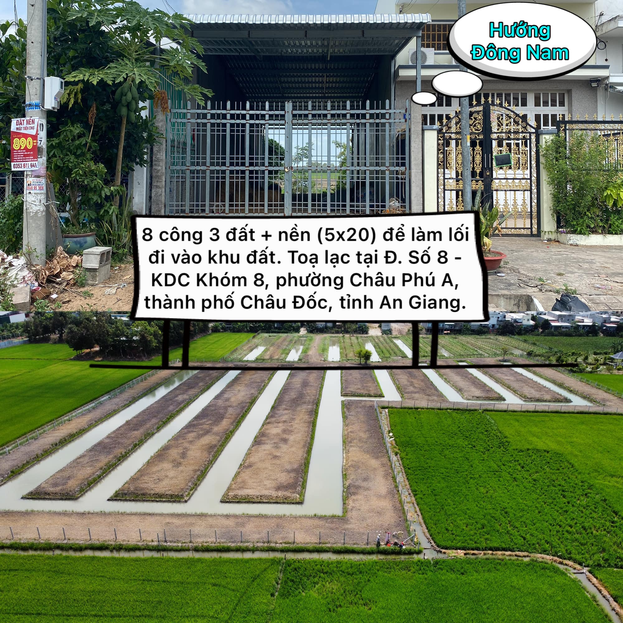 Cần bán 8 công 3 đất + nền (5×20) để làm lối đi vào khu đất. Toạ lạc tại Đ. Số 8 – KDC Khóm 8, phường Châu Phú A, thành phố Châu Đốc, tỉnh An Giang.