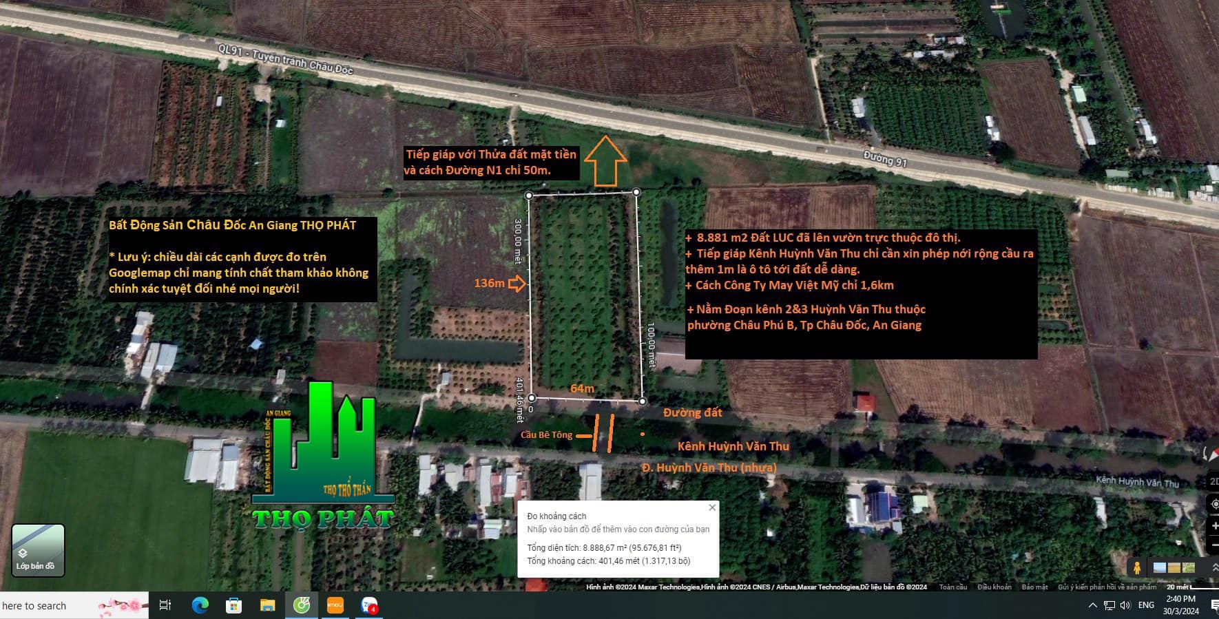 Cần bán 8 công 9 đất đã lên vườn vuông vứt rất đẹp mặt tiền Kênh Huỳnh Văn Thu và phía sau tiếp giáp với thửa đất mặt tiền Đ. N1, phường Châu Phú B, thành phố Châu Đốc, tỉnh An Giang.