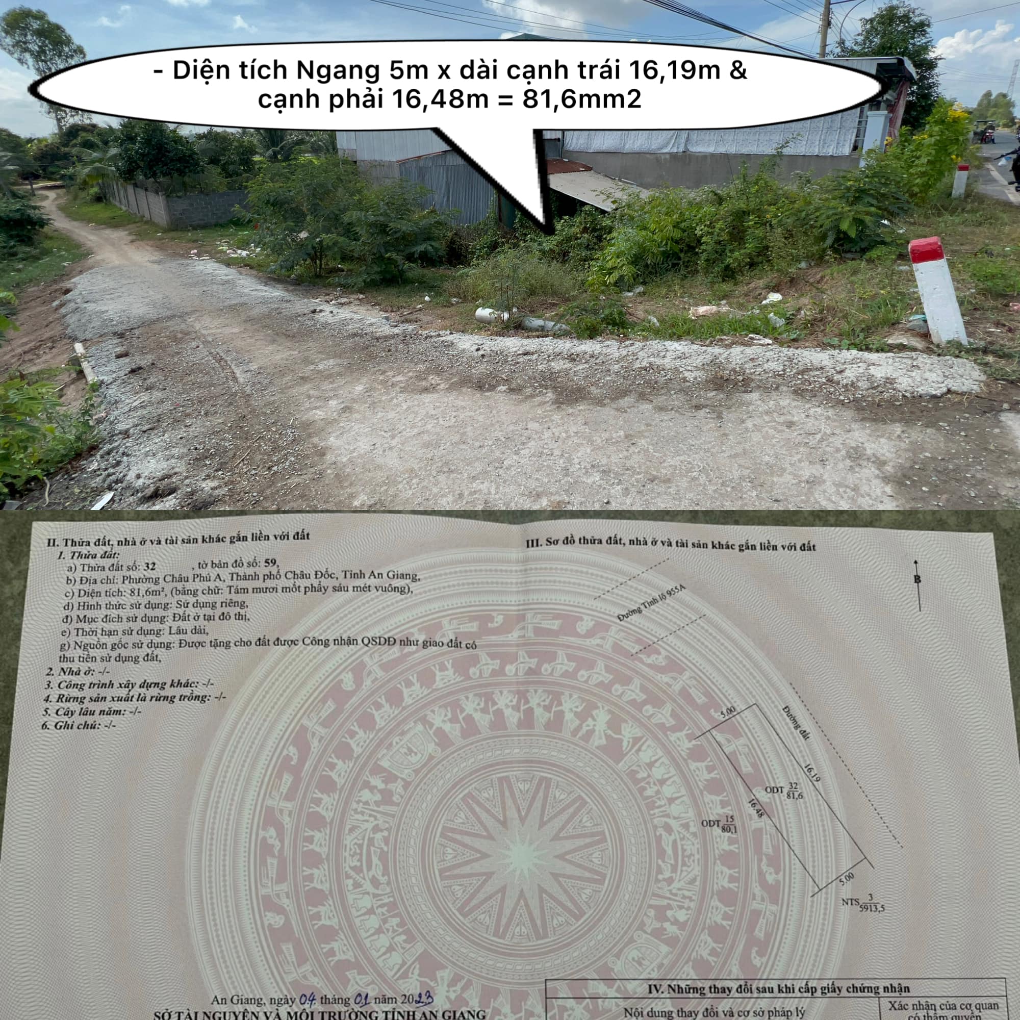 – Diện tích Ngang 5m x dài cạnh trái 16,19m & cạnh phải 16,48m = 81,6m2