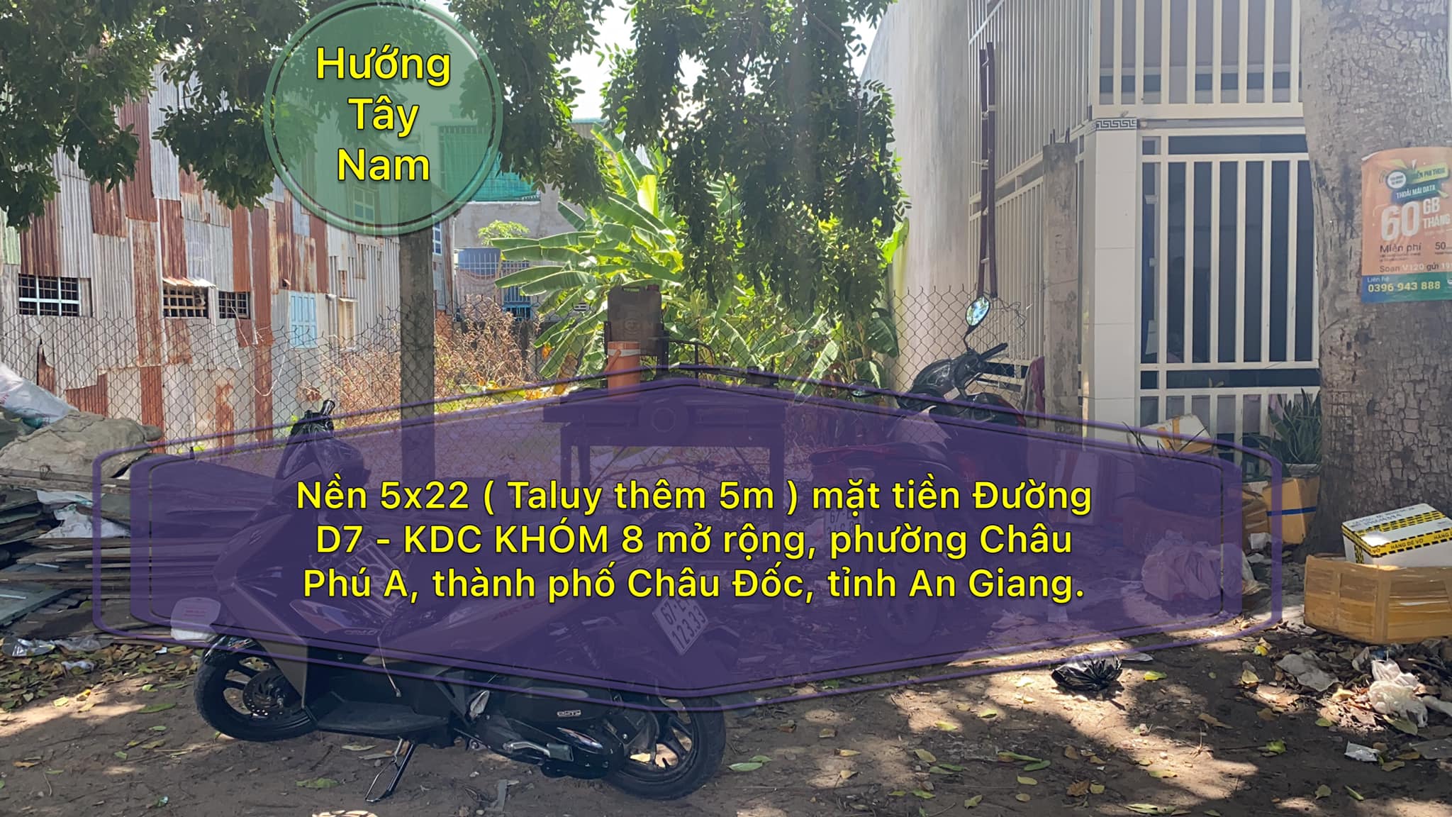 Cần bán nền 5×22 ( Taluy thêm 5m ) mặt tiền Đường D7 – KDC KHÓM 8 mở rộng, phường Châu Phú A, thành phố Châu Đốc, tỉnh An Giang. Sau lưng SIÊU THỊ ĐIỆN MÁY CHỢ LỚN, cách Đ. Tân Lộ Kiều Lương 100m.