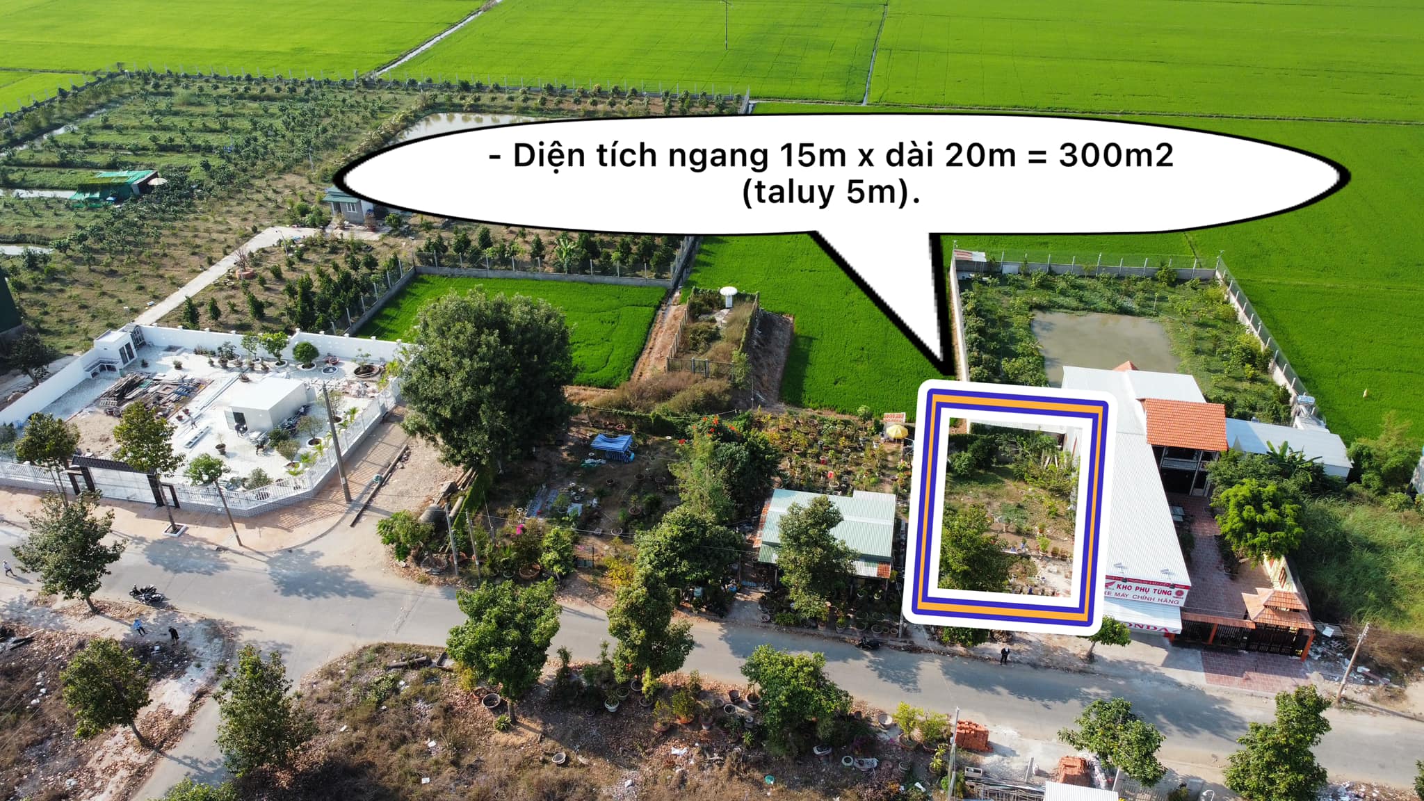 – Diện tích ngang 15m x dài 20m = 300m2 (taluy 5m).