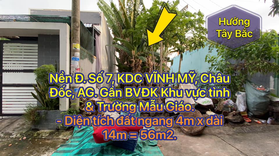 Cần bán nền Đ. Số 7, KDC VĨNH MỸ, Châu Đốc, AG. Gần BVĐK Khu vực tỉnh & Trường Mẫu Giáo. – Diện tích đất ngang 4m x dài 14m = 56m2