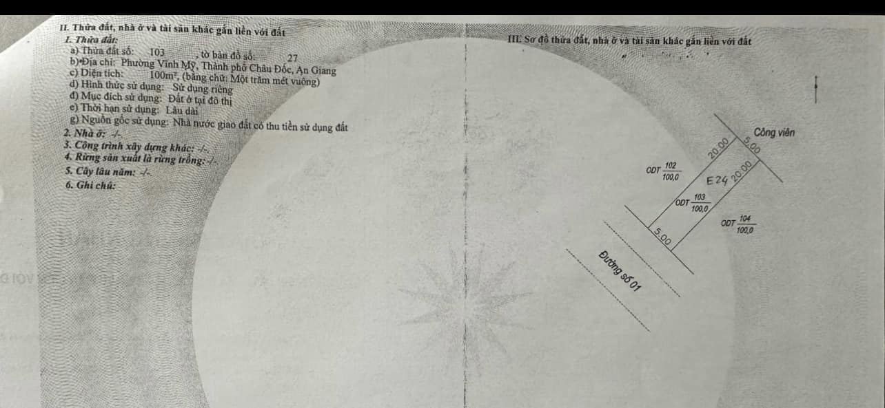 – Diện tích đất Ngang 5m x dài 20m = 100m2. Đất ở đô thị