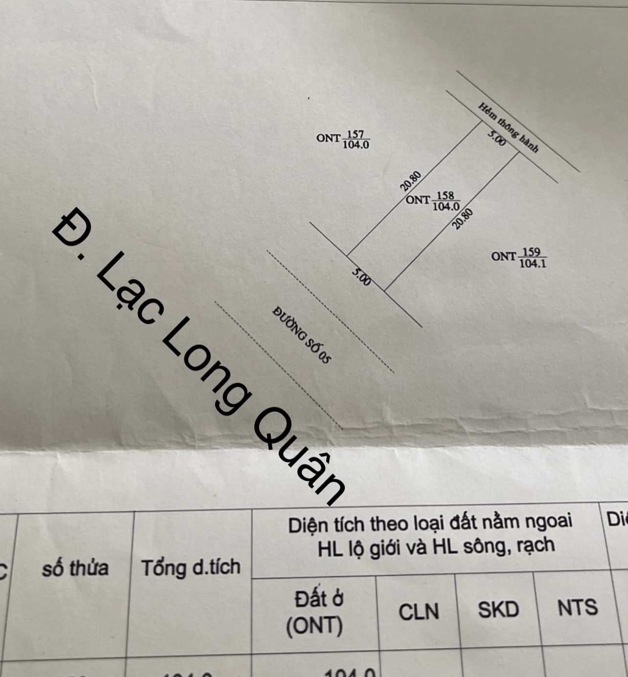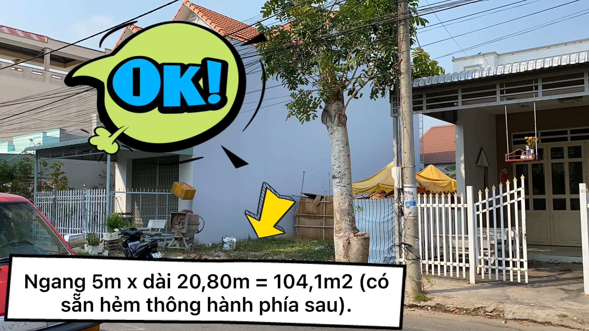 – Ngang 5m x dài 20,80m = 104,1m2 (có sẵn hẻm thông hành phía sau).