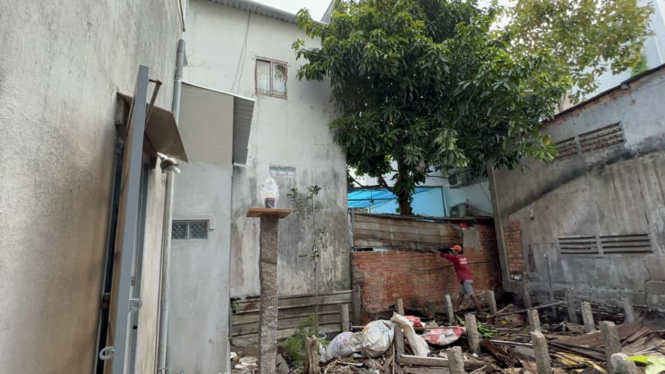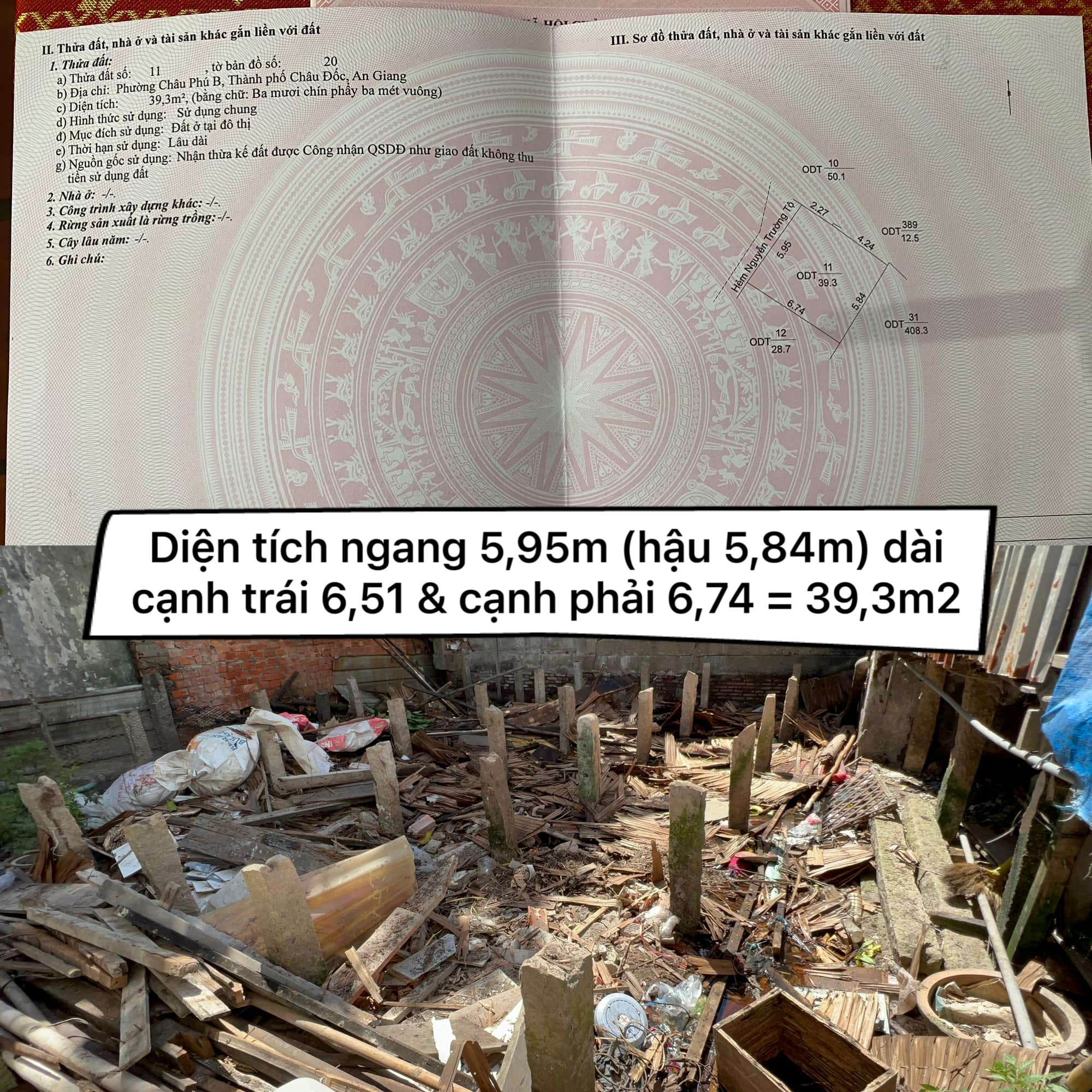 – Diện tích ngang 5,95m (hậu 5,84m) dài cạnh trái 6,51 & cạnh phải 6,74 = 39,3m2.