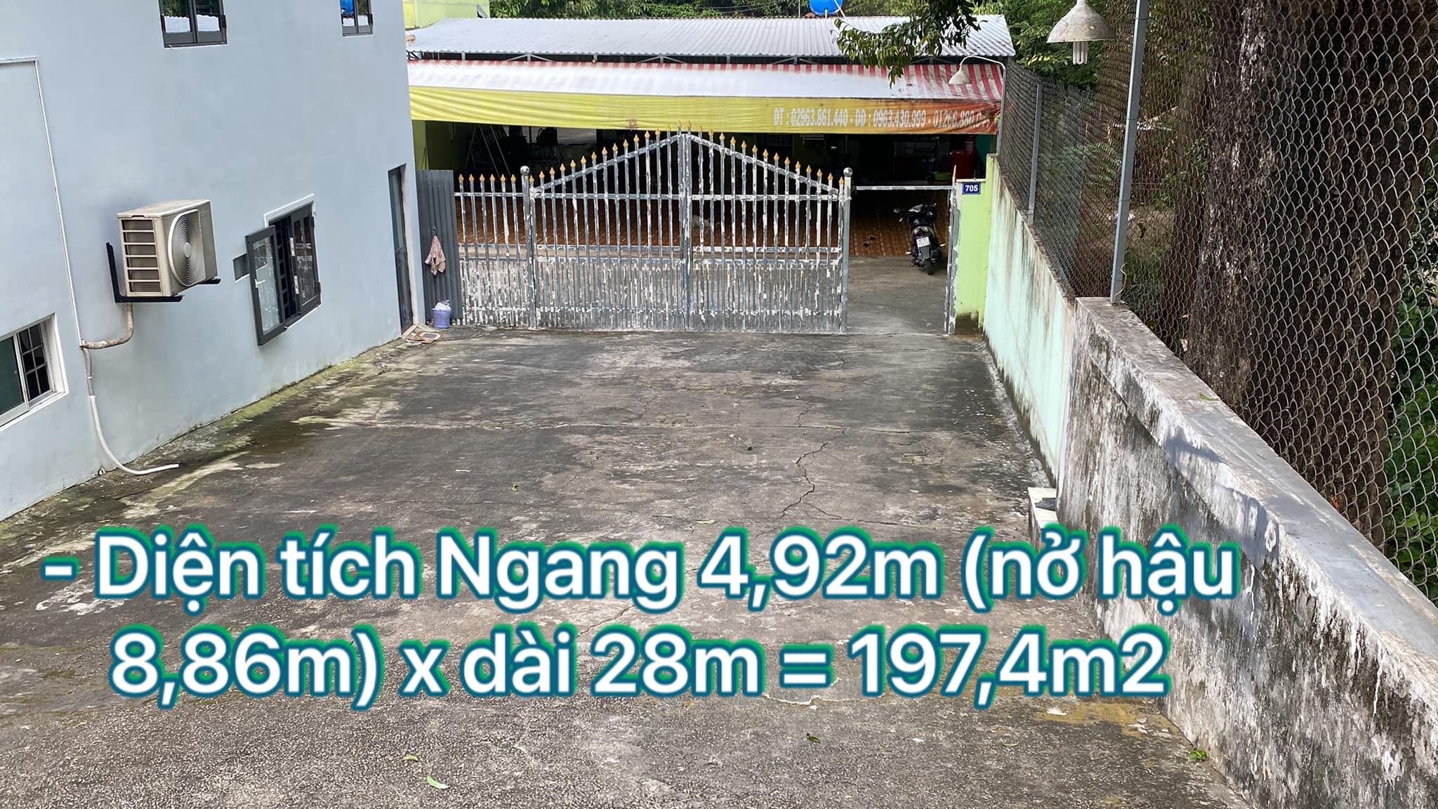 – Diện tích Ngang 4,92m (nở hậu 8,86m) x dài 28m = 197,4m2
