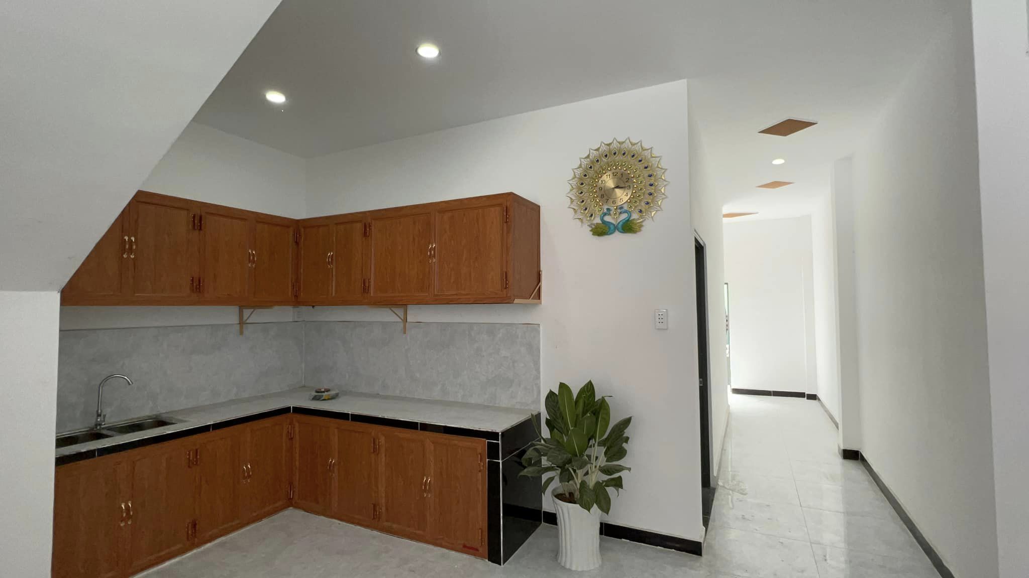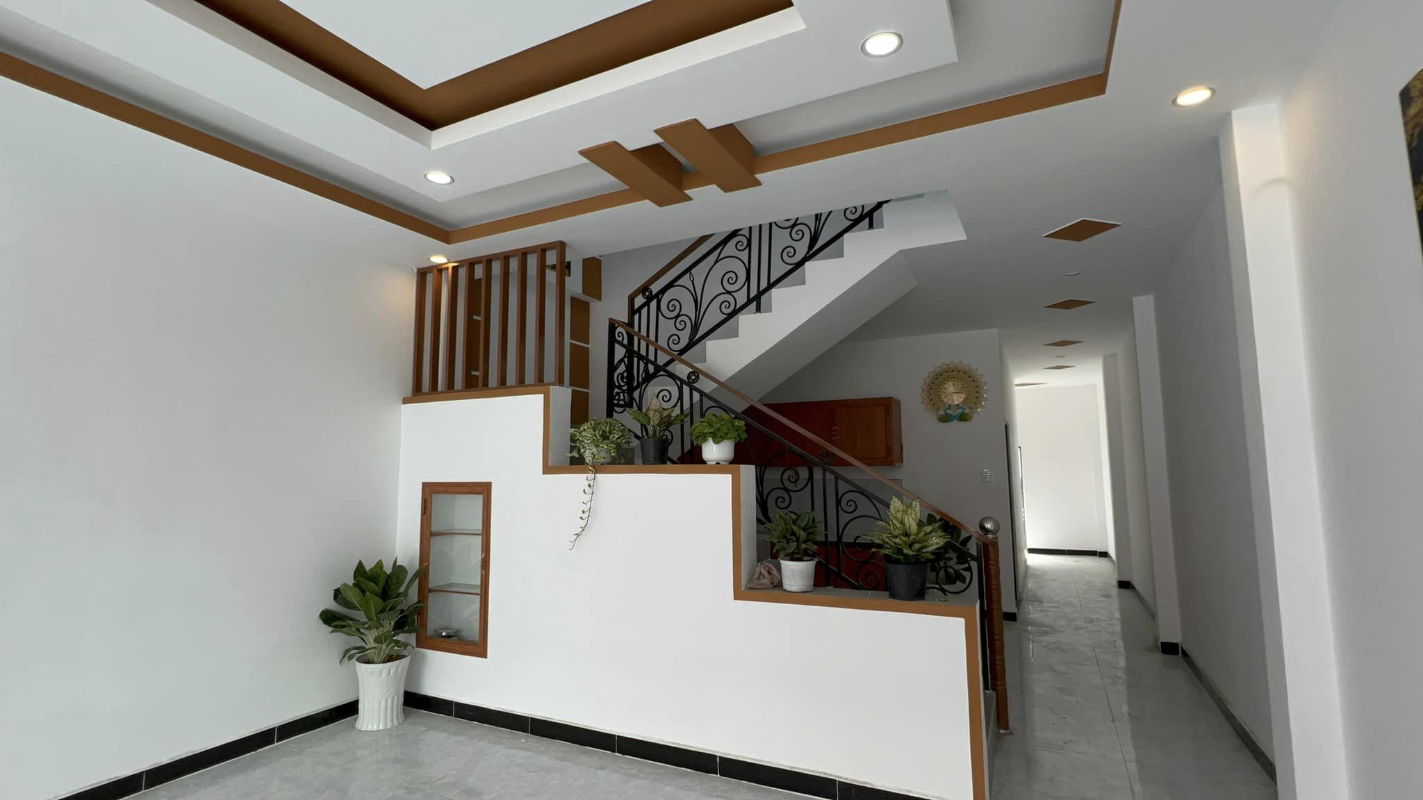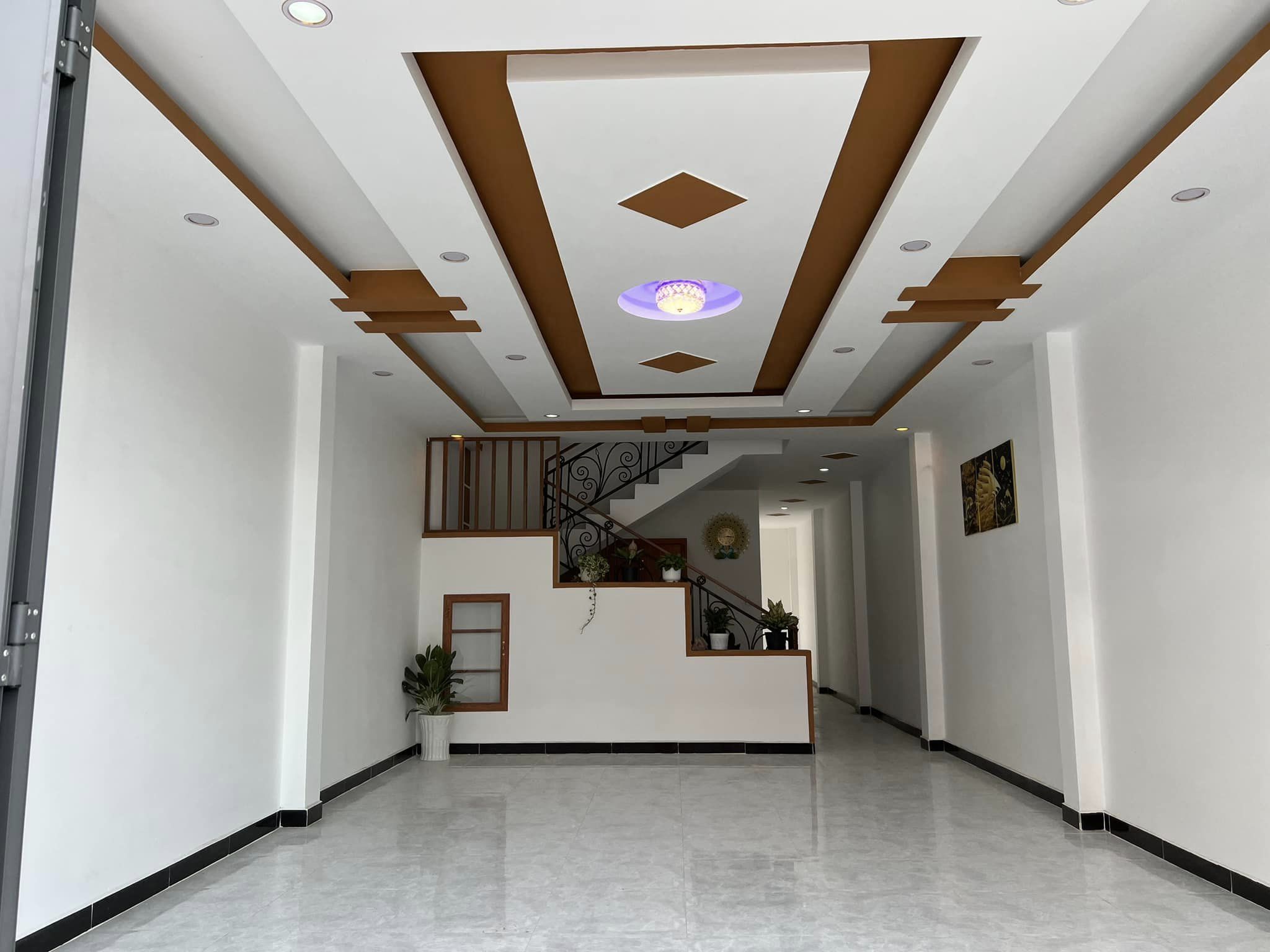 1. Tầng trệt gồm phòng khách lớn, phòng ngủ, bếp rộng + toilet. Sàn lót gạch + vách tường trần la phôn kiểu đèn led hiện đại. Có 2 hẻm thông hành bên phải và sau nhà.