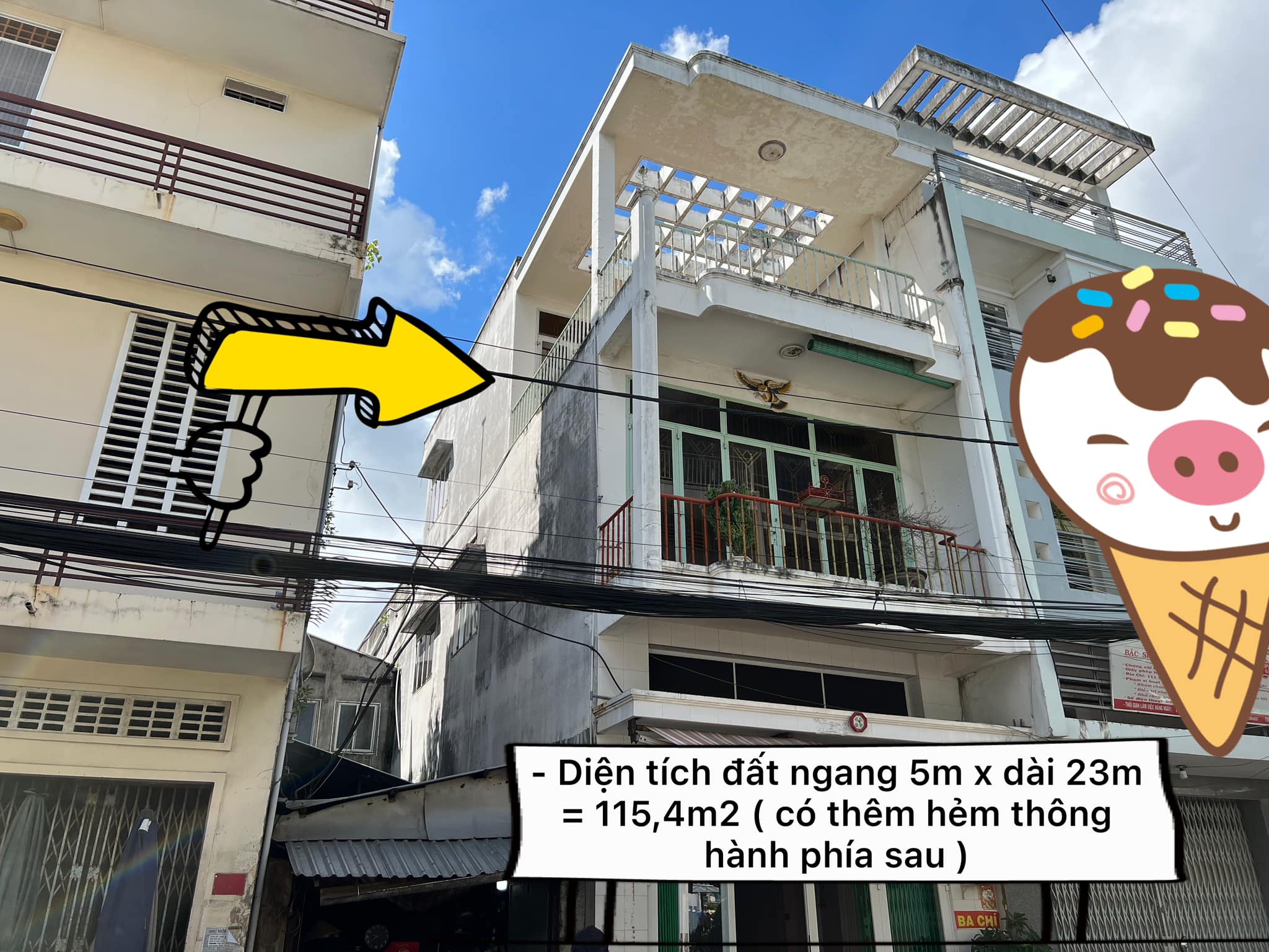 – Diện tích đất ngang 5m x dài 23m = 115,4m2 ( có thêm hẻm thông hành phía sau )