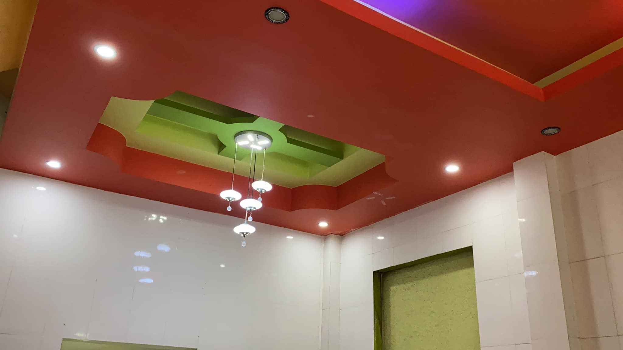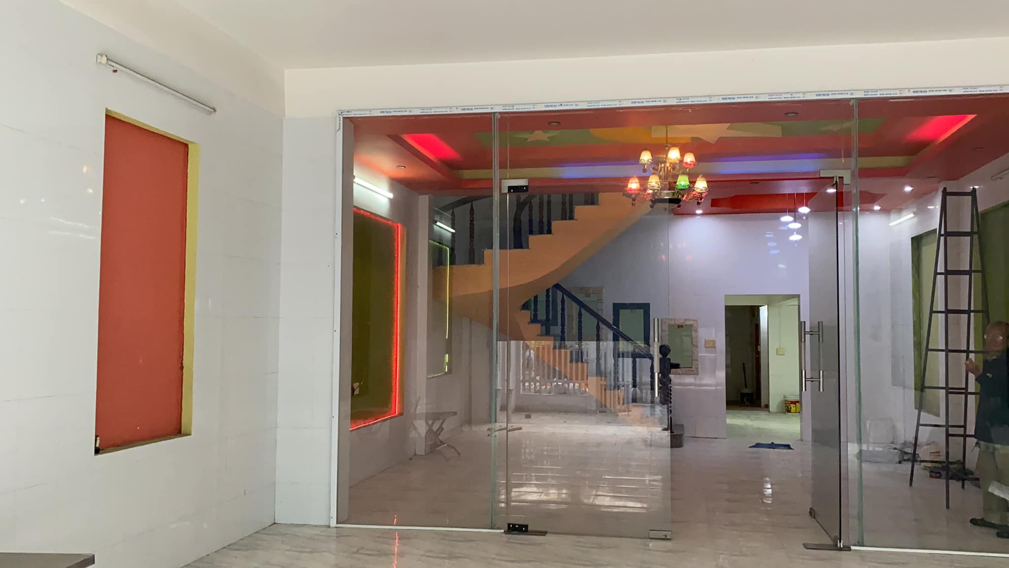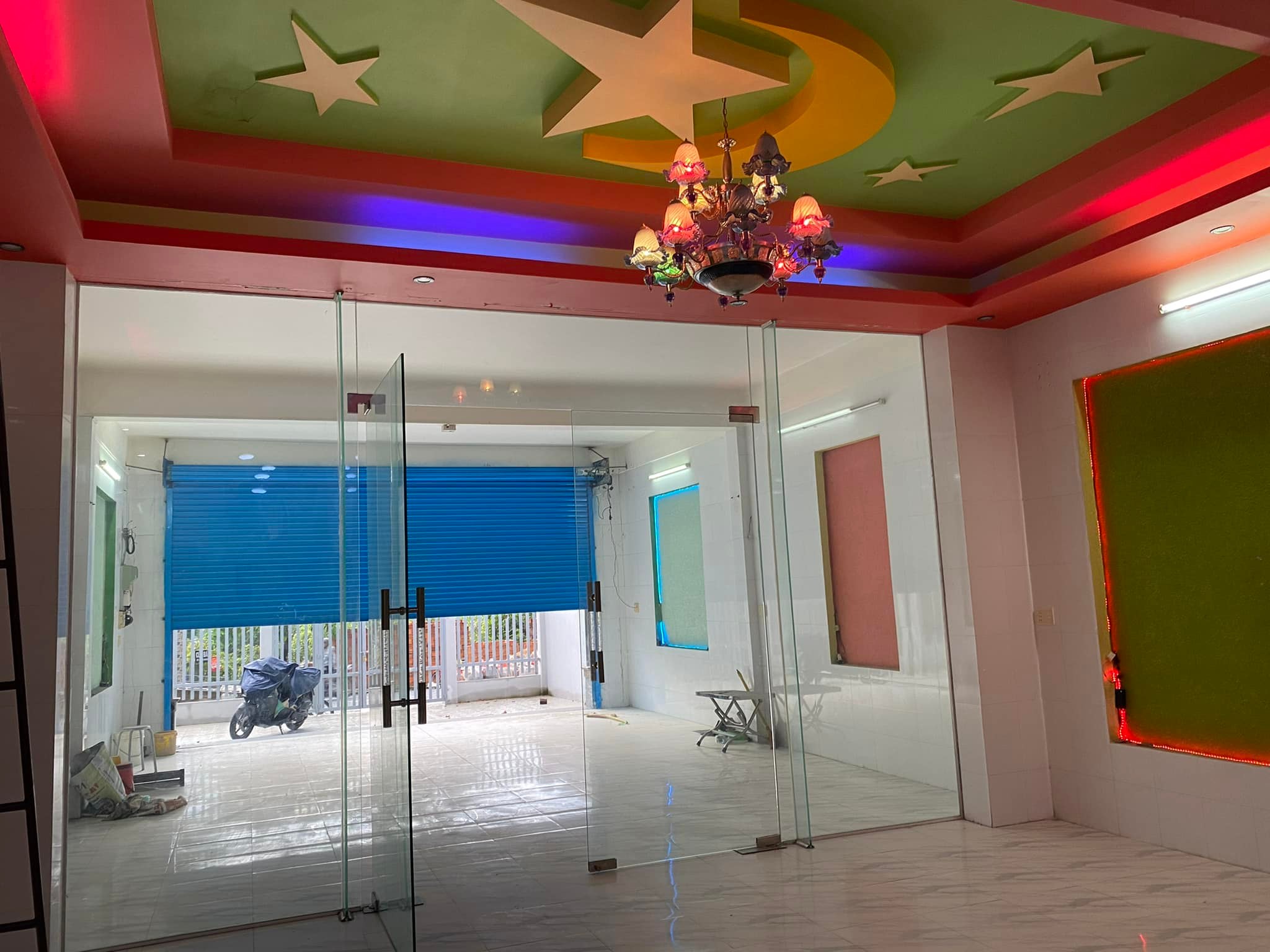 1. Tầng trệt gồm sân, 2 phòng khách ngăn cửa kính, phòng ngủ, bếp rộng & nhà vệ sinh. Vách tường ốp gạch tới nóc, sàn lót gạch, tay nắm cầu thang gỗ, cửa cuốn tụe động.