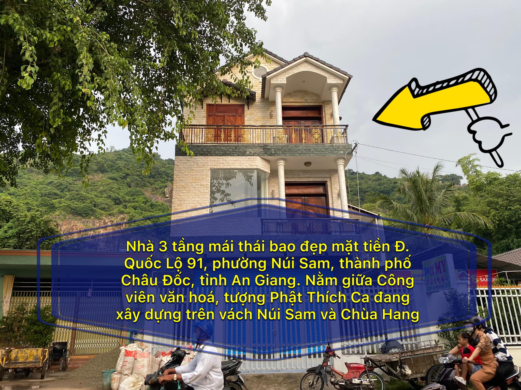 Cần bán nhà 3 tầng mái thái bao đẹp mặt tiền Đ. Quốc Lộ 91, phường Núi Sam, thành phố Châu Đốc, tỉnh An Giang. Nằm giữa Công viên văn hoá, tượng Phật Thích Ca đang xây dựng trên vách Núi Sam và Chùa Hang