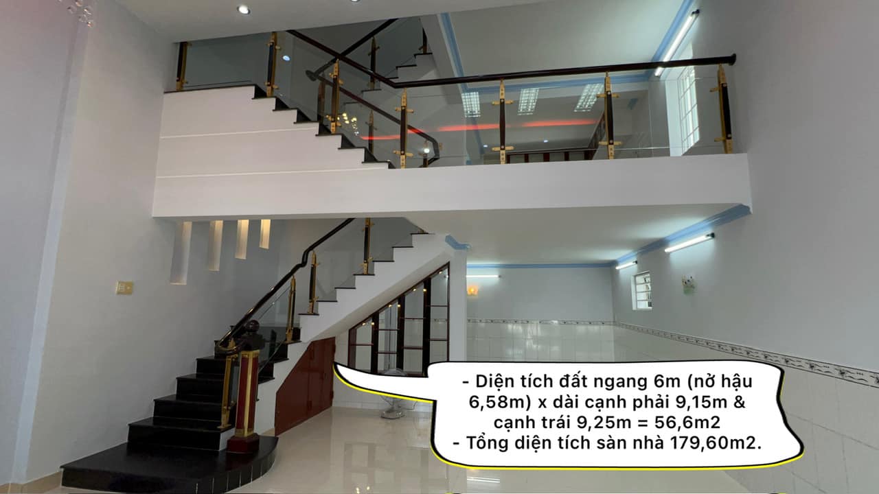 – Diện tích đất ngang 6m (nở hậu 6,58m) x dài cạnh phải 9,15m & cạnh trái 9,25m = 56,6m2
