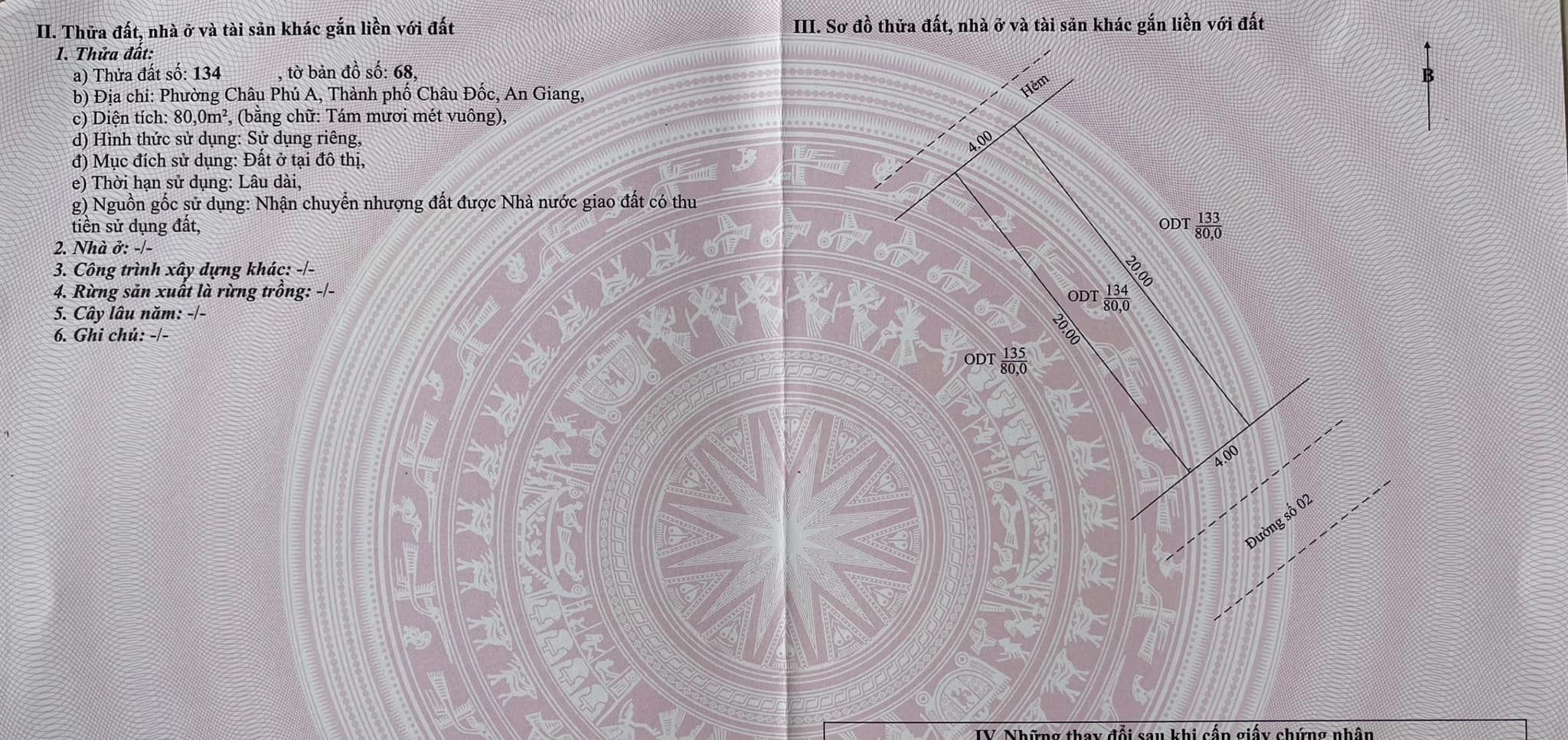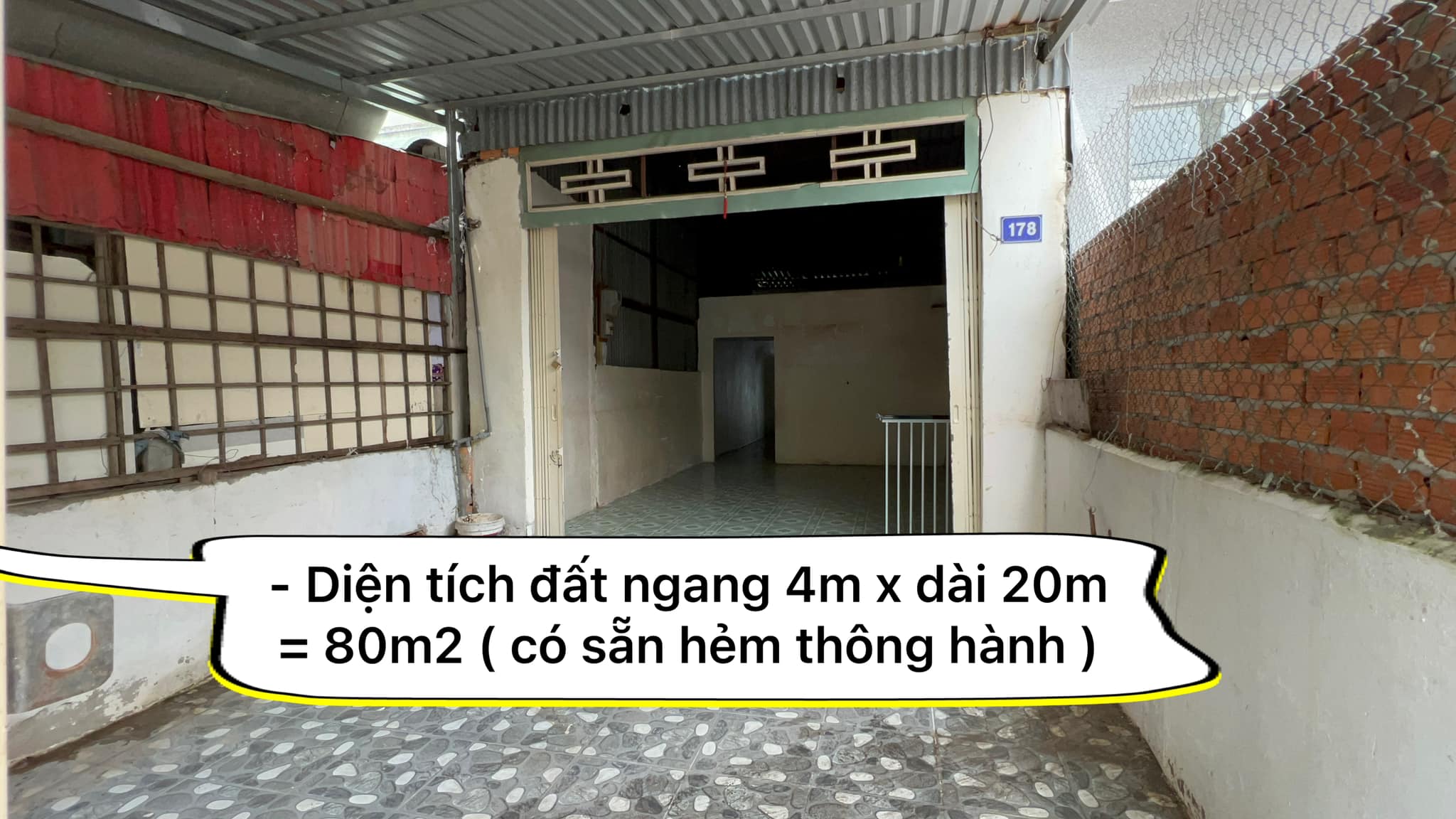 – Diện tích đất ngang 4m x dài 20m = 80m2 ( có sẵn hẻm thông hành )