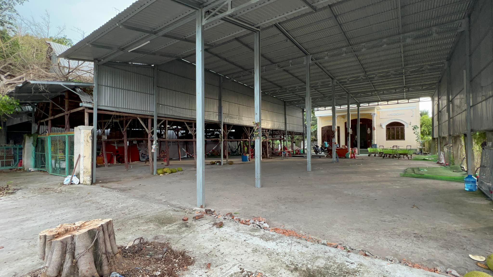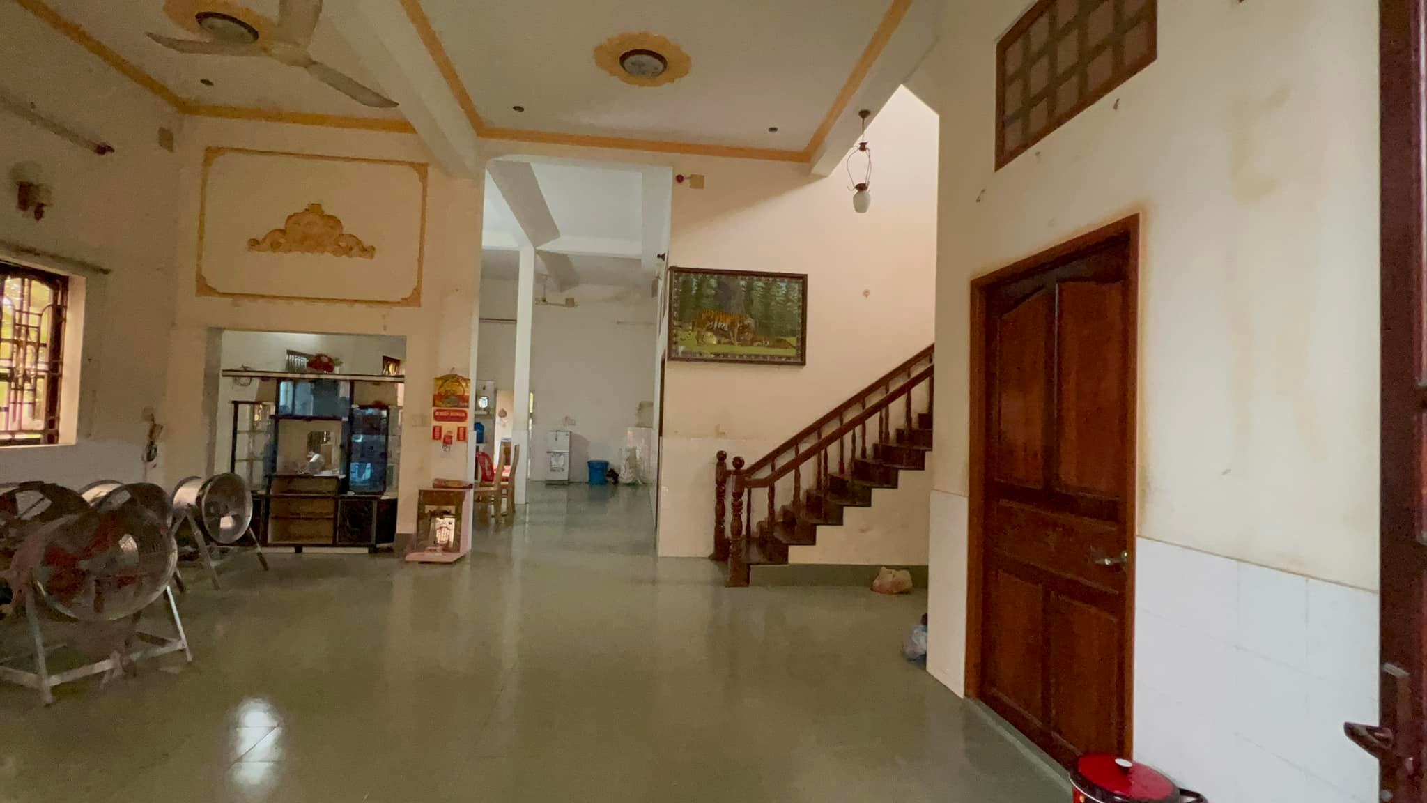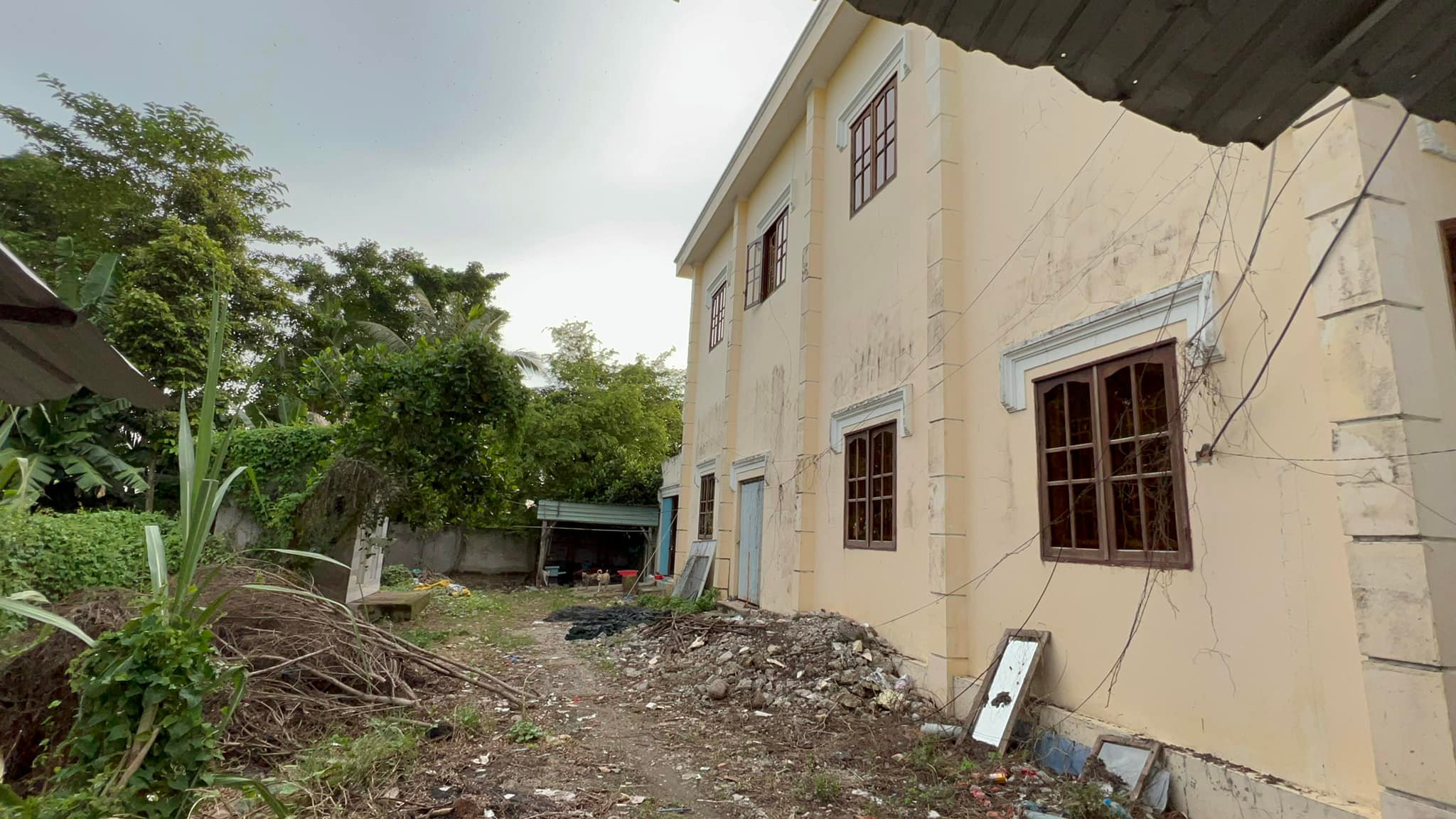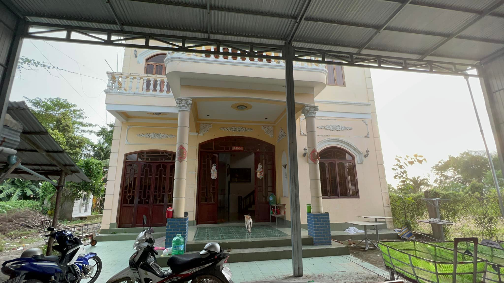 1. Tầng trệt gồm Sân rất rộng có mái tiền chế, phòng khách lớn, 2 phòng ngủ, bếp, toilet, 2 nhà vệ sinh công cộng bên ngoài. Cửa gỗ, cầu thang gỗ, sàn lót gạch vách tường.