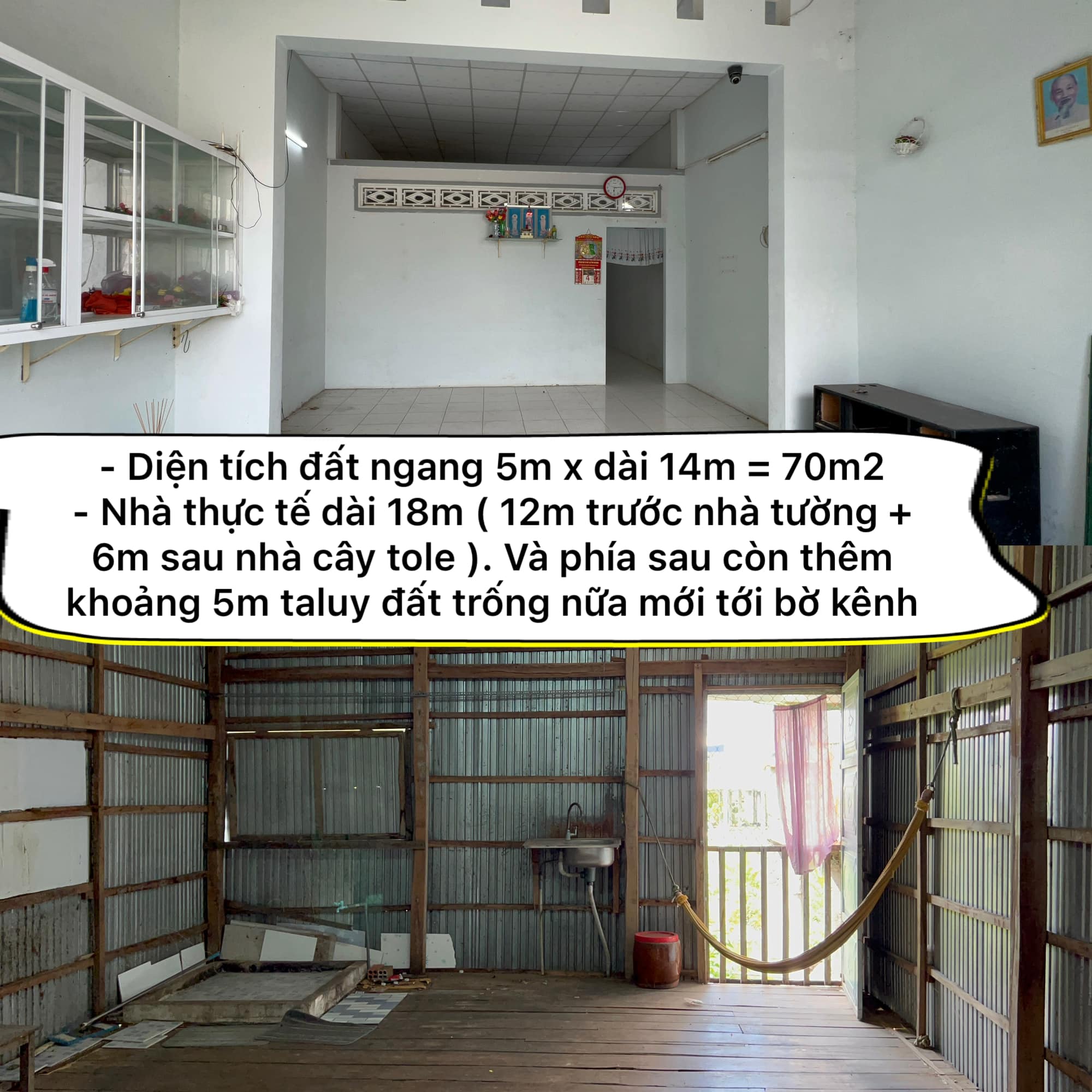 – Nhà thực tế dài 18m ( 12m trước nhà tường + 6m sau nhà cây tole ). Và phía sau còn thêm khoảng 5m taluy đất trống nữa mới tới bờ kênh