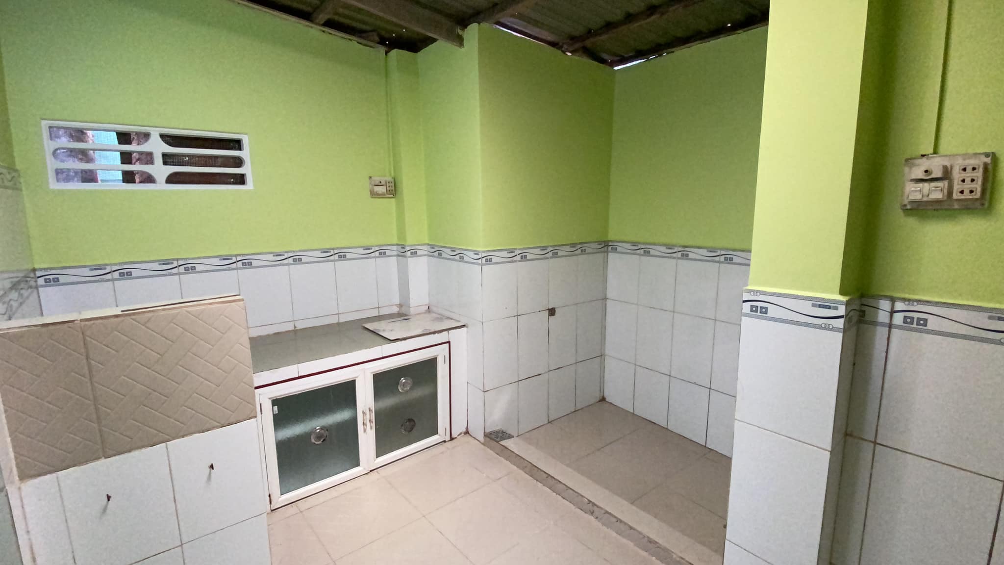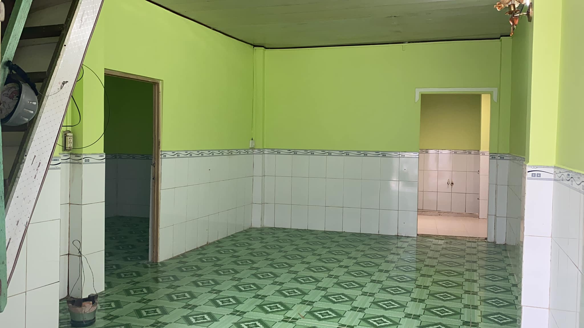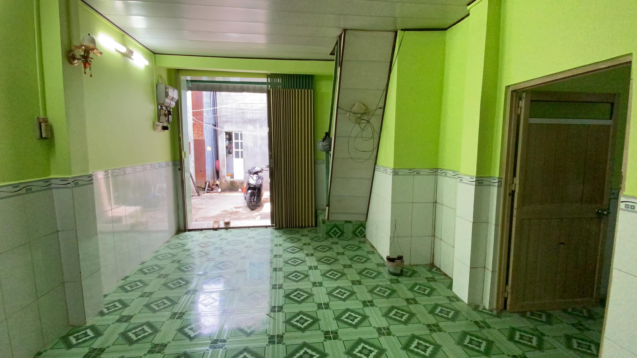 1. Tầng trệt gồm sân, phòng khách, phòng ngủ, bếp & toilet. Sàn lót gạch, vách tường.