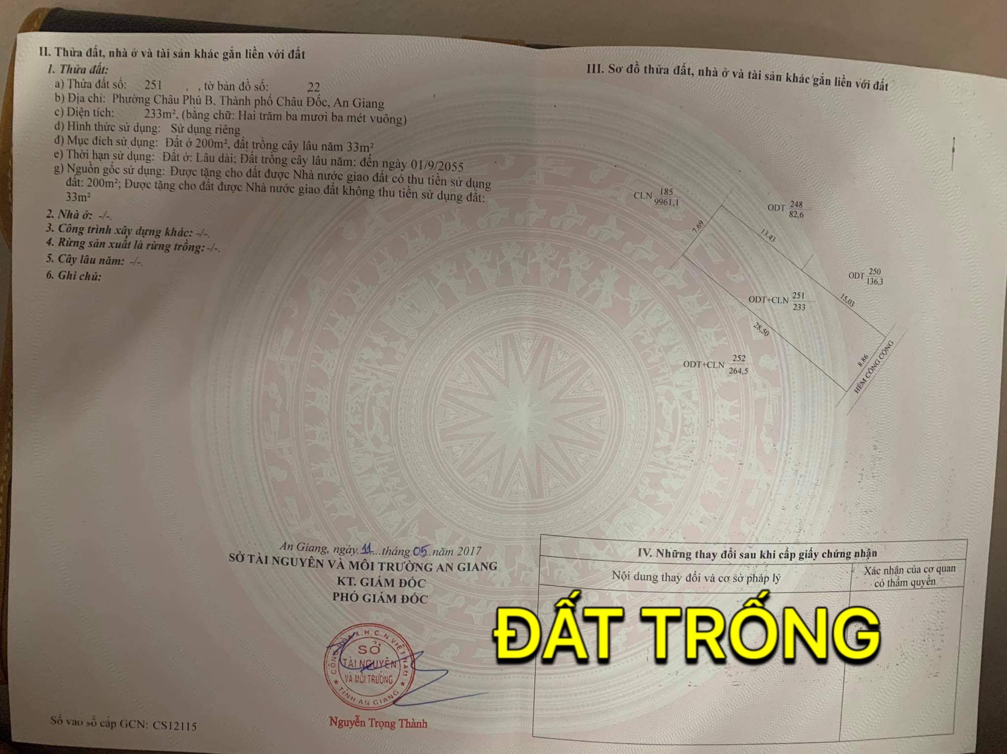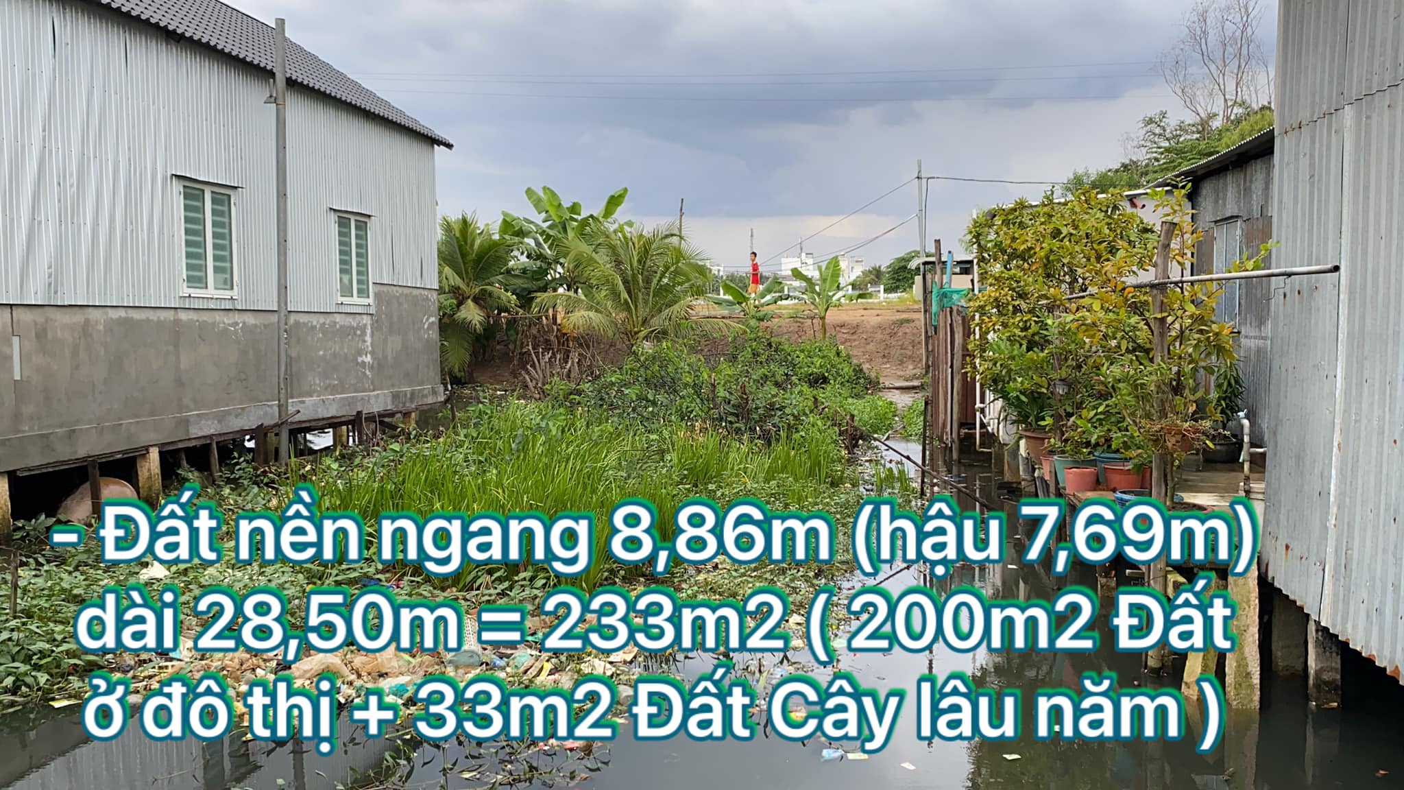 – Đất nền ngang 8,86m (hậu 7,69m) dài 28,50m = 233m2 ( 200m2 Đất ở đô thị + 33m2 Đất Cây lâu năm )