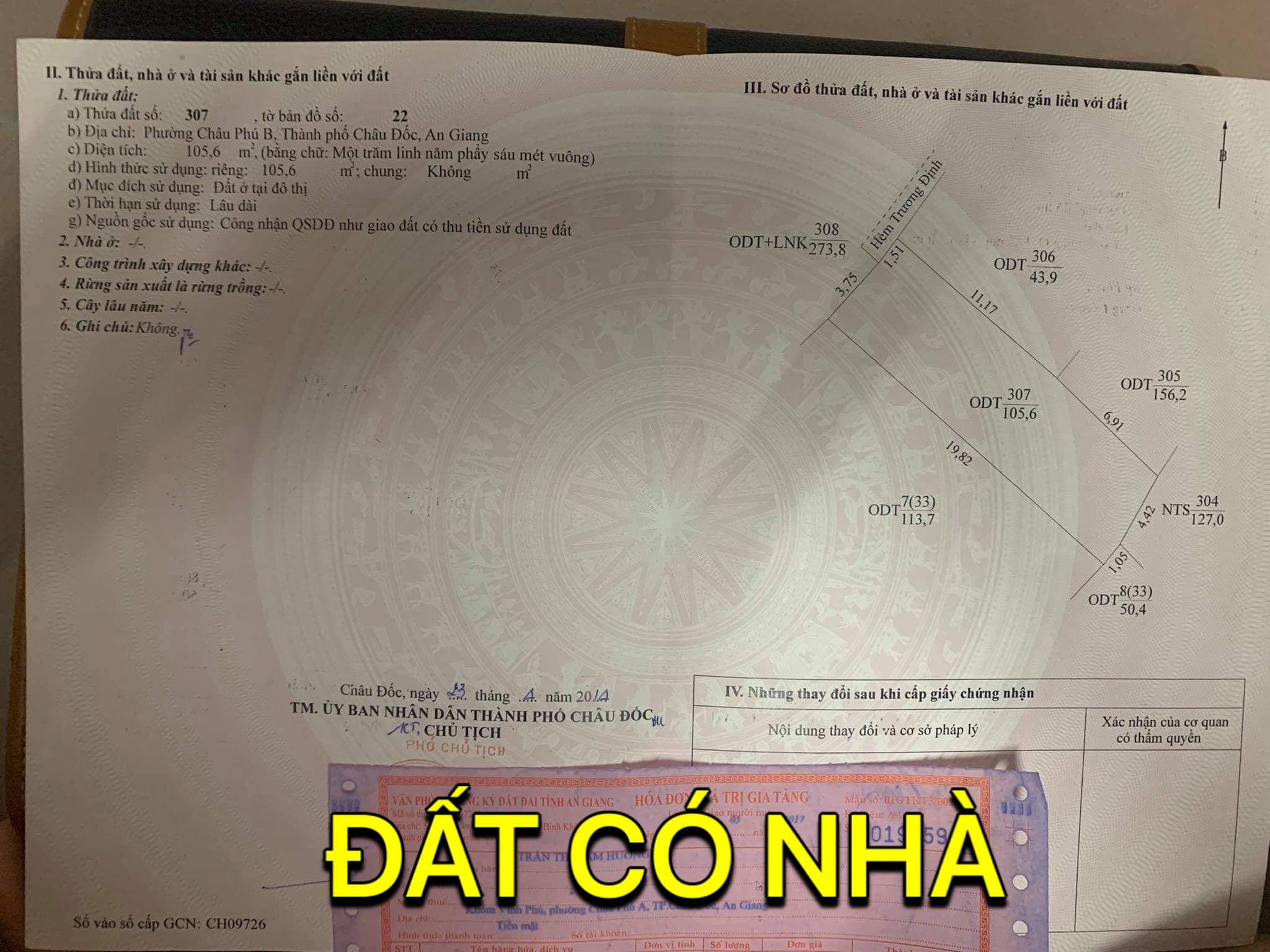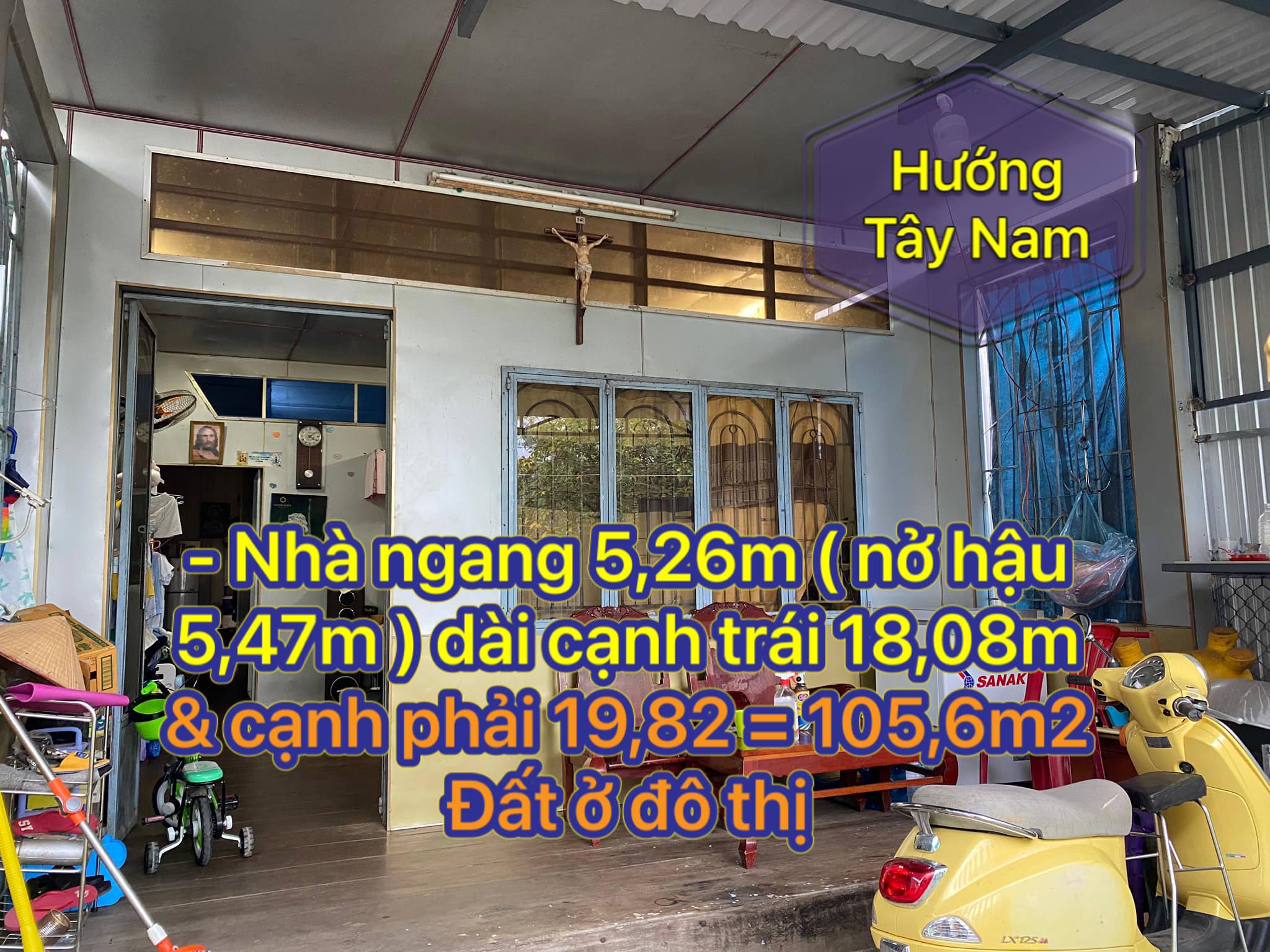 – Nhà ngang 5,26m ( nở hậu 5,47m ) dài cạnh trái 18,08m & cạnh phải 19,82 = 105,6m2 Đất ở đô thị