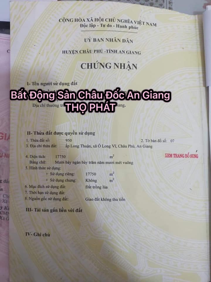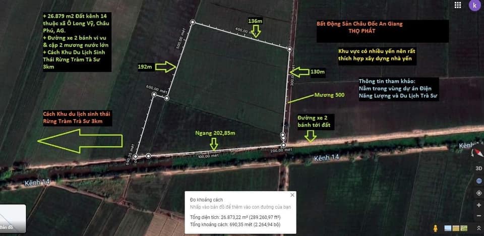 Cần vốn kinh doanh nên bán 26.879m2 Đất lúa thuộc kênh 14 Xã Ô Long Vĩ, huyện Châu Phú, tỉnh An Giang nằm trong vùng dự án du lịch sinh thái Trà Sư & điện năng lượng.