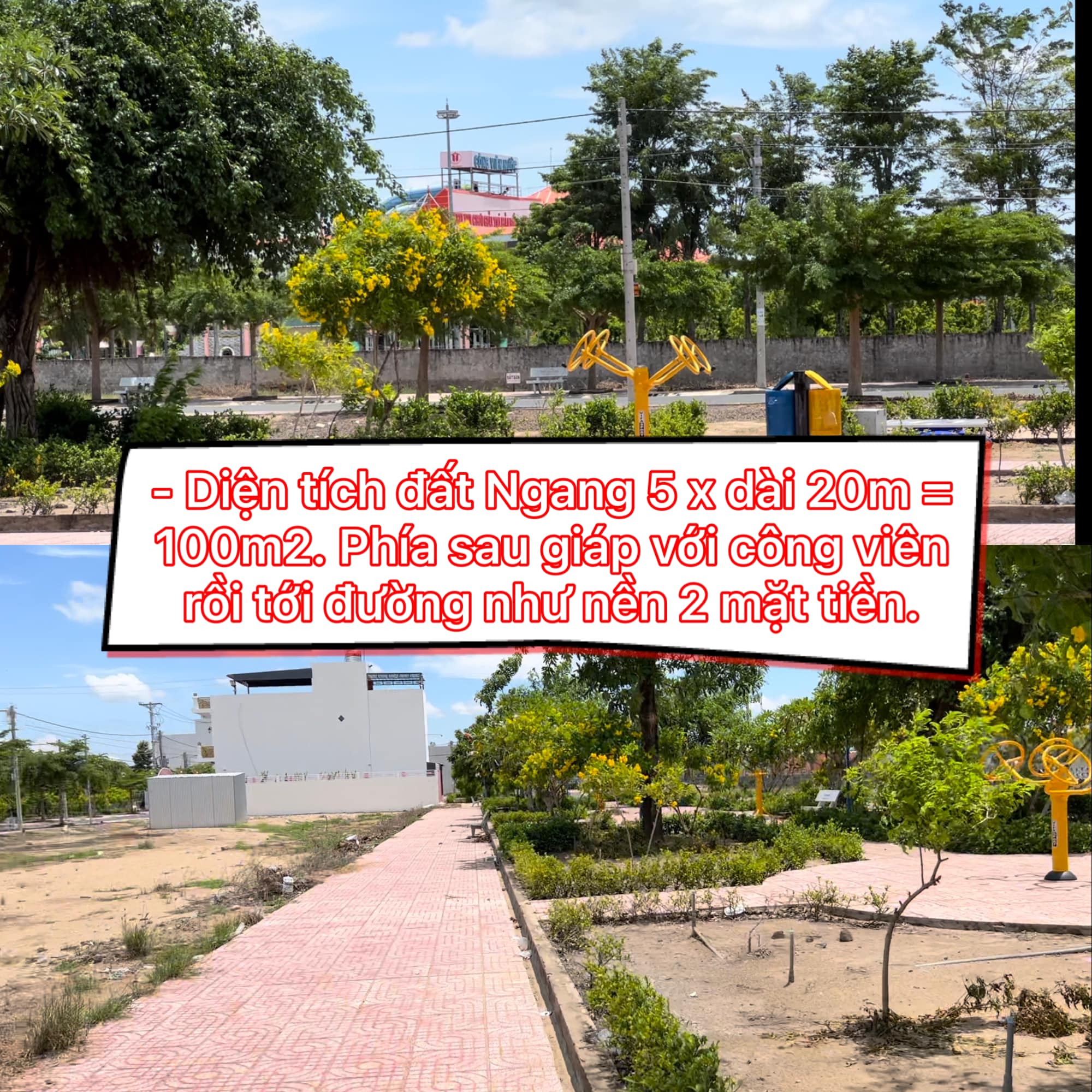 – Diện tích đất Ngang 5 x dài 20m = 100m2. Phía sau giáp với công viên rồi tới đường như nền 2 mặt tiền.