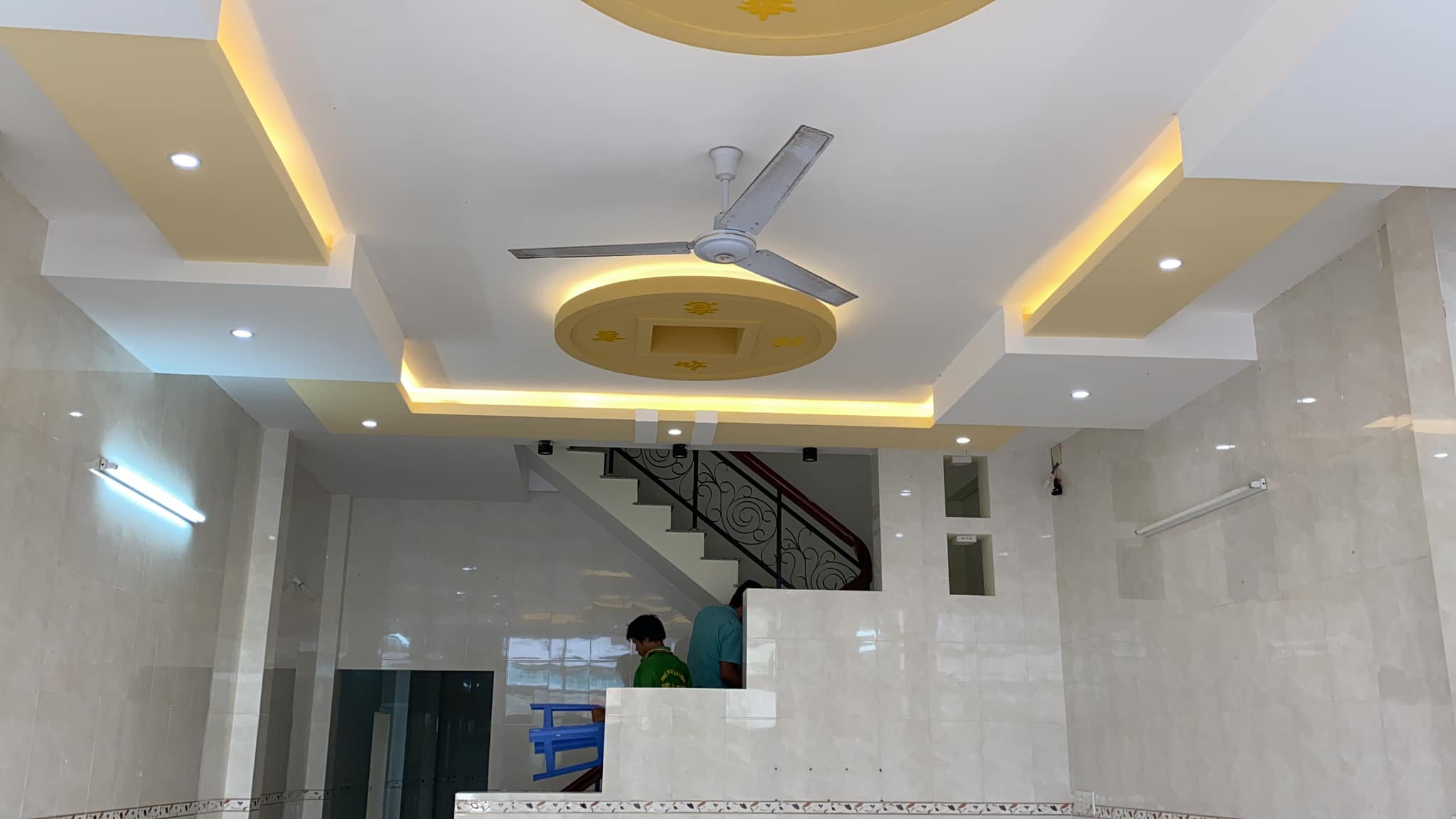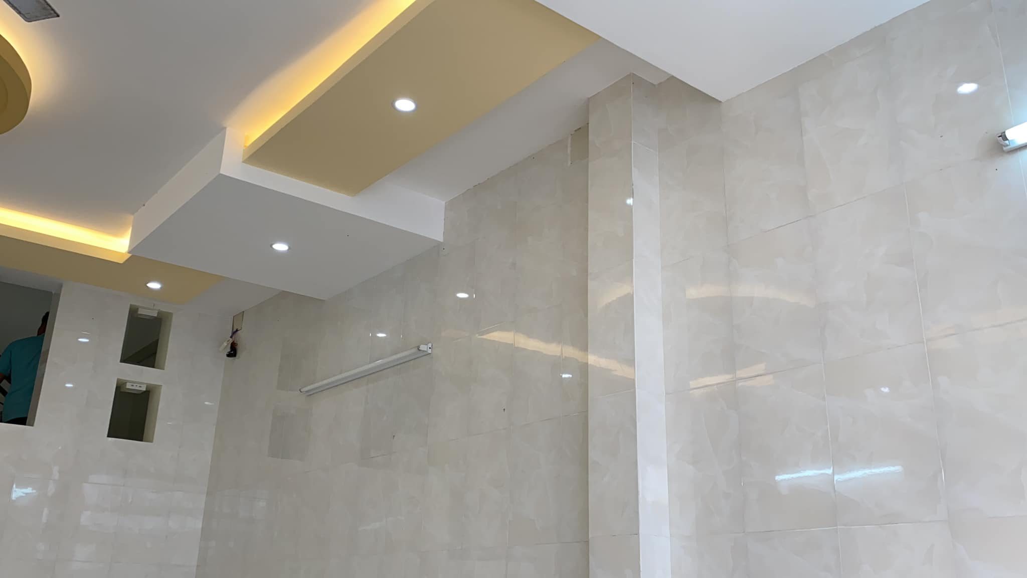 – Tầng trệt gồm phòng khách lớn đậu được xe ô tô, bếp & nhà vệ sinh bao rộng, cửa thông hành qua nhà kế bên. Vách tường ốp gạch, sàn lót gạch, trần la phông kiểu đèn hiện đại.